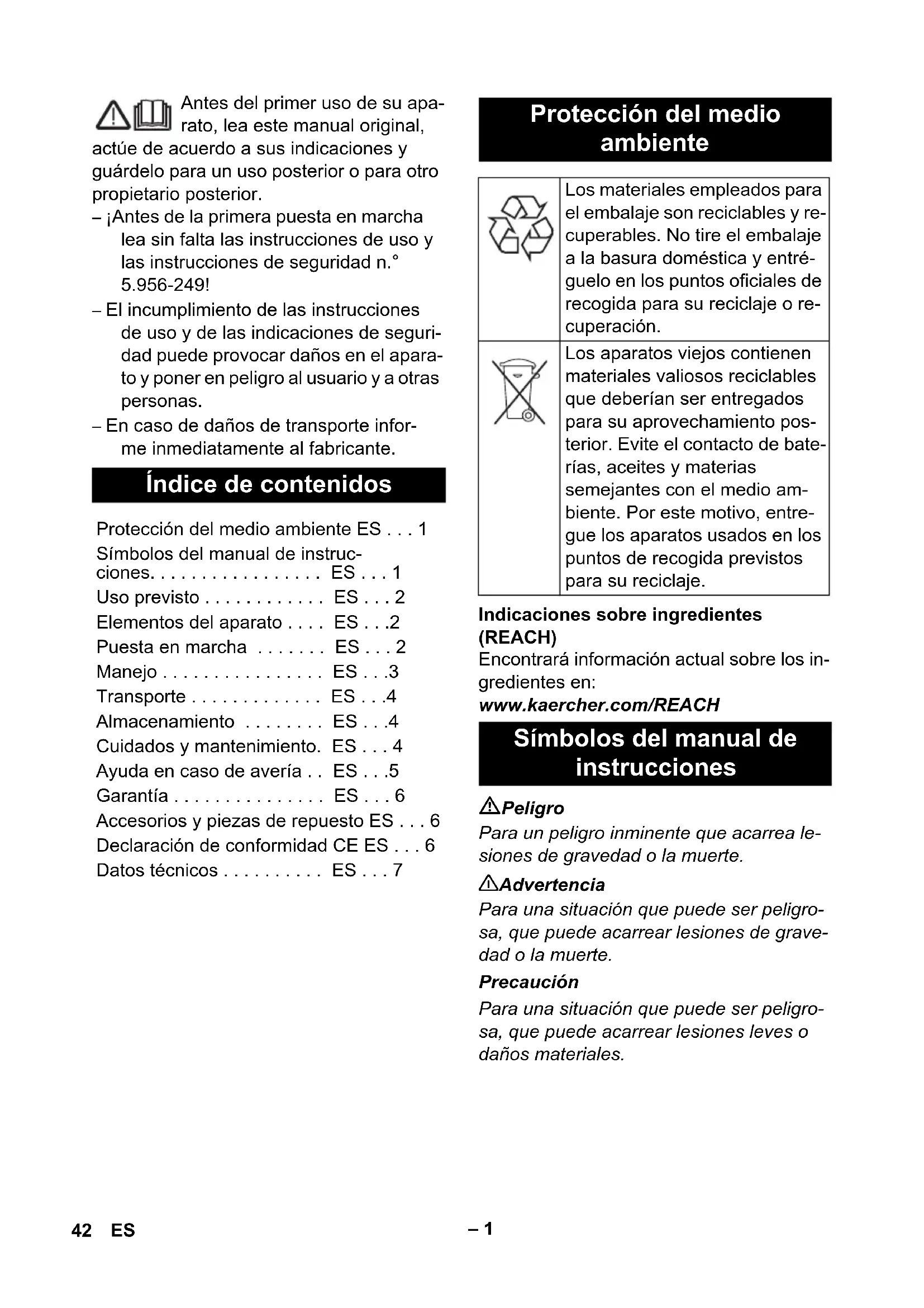 - Onderdeelnr. Lengte snoer EU 6.649-915.0 10 m 41NL– 1 Antes del primer uso de su apa- rato, lea este manual original, actúe de acuerdo a sus indicaciones y guárdelo para un uso posterior o para otro propietario posterior. – ¡Antes de la primera puesta en marcha lea sin falta las instrucciones de uso y las instrucciones de seguridad n.° 5.956-249! – El incumplimiento de las instrucciones de uso y de las indicaciones de seguri- dad puede provocar daños en el apara- to y poner en peligro al usuario y a otras personas. – En caso de daños de transporte infor- me inmediatamente al fabricante. Indicaciones sobre ingredientes (REACH) Encontrará información actual sobre los in- gredientes en: www.kaercher.com/REACH Peligro Para un peligro inminente que acarrea le- siones de gravedad o la muerte. 몇 Advertencia Para una situación que puede ser peligro- sa, que puede acarrear lesiones de grave- dad o la muerte. Precaución Para una situación que puede ser peligro- sa, que puede acarrear lesiones leves o daños materiales. Índice de contenidos Protección del medio ambiente ES Símbolos del manual de instruc- ciones p. 1