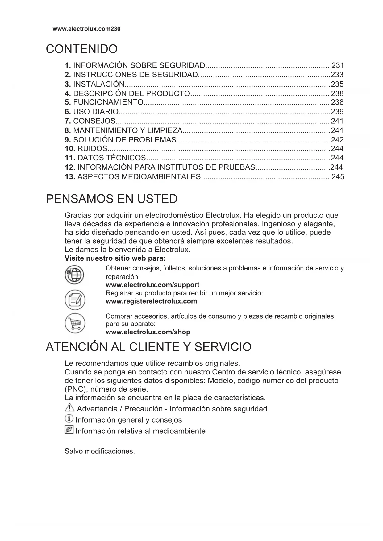 Le recomendamos que utilice recambios originales. Cuando se ponga en contacto con nuestro Centro de servicio técnico, asegúrese de tener los siguientes datos disponibles: Modelo, código numérico del producto (PNC), número de serie. La información se encuentra en la placa de características. Advertencia / Precaución - Información sobre seguridad Información general y consejos Información relativa al medioambiente Salvo modificaciones. www.electrolux.com2301. INFORMACIÓN SOBRE SEGURIDAD Antes de instalar y utilizar el aparato, lea atentamente las instrucciones facilitadas. El fabricante no se hace responsable de lesiones o daños producidos como resultado de una instalación o un uso incorrectos. Conserve siempre estas instrucciones en lugar seguro y accesible para futuras consultas.
