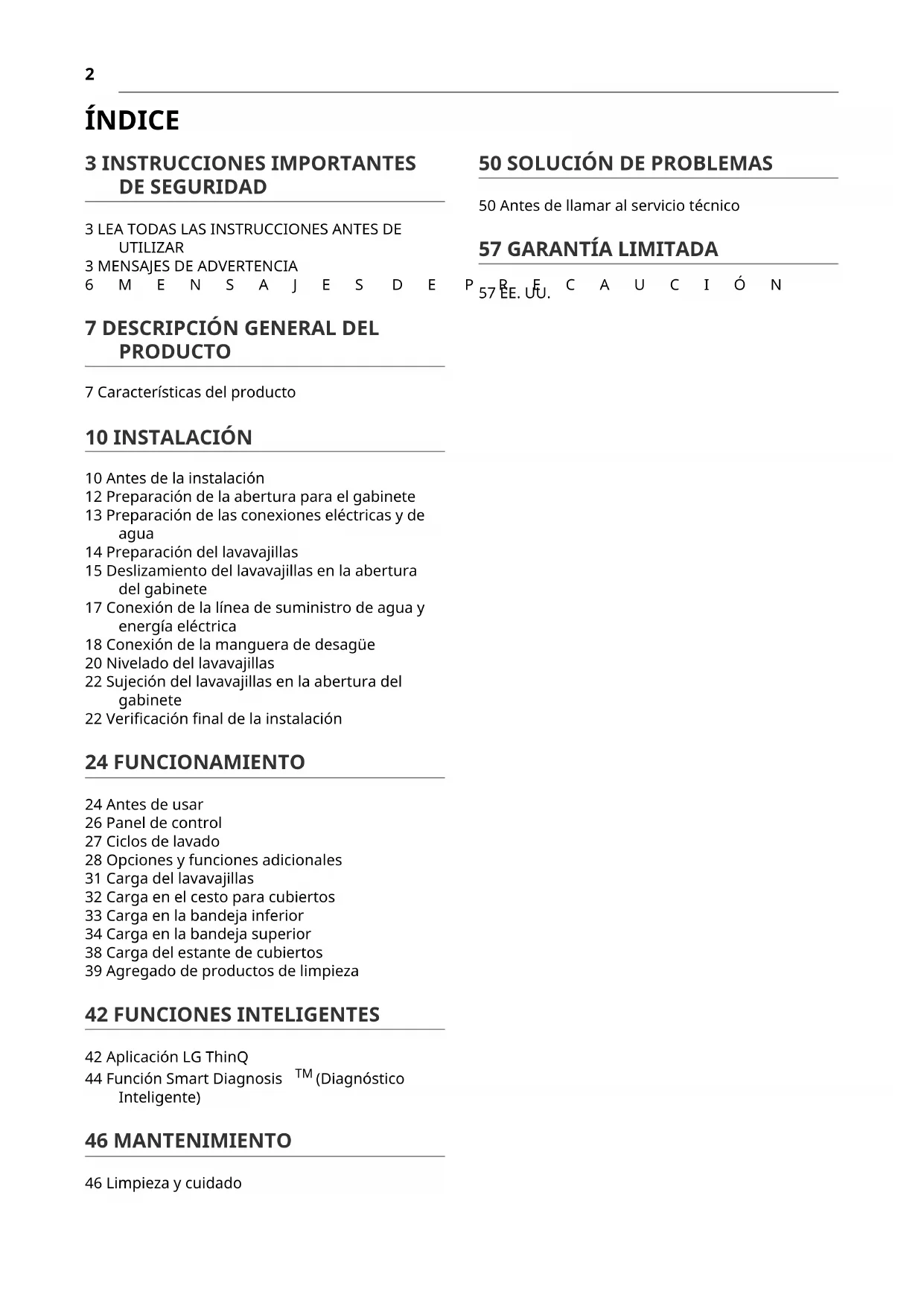 PRODUCTO 7 Características del producto 10 INSTALACIÓN 10 Antes de la instalación 12 Preparación de la abertura para el gabinete 13 Preparación de las conexiones eléctricas y de agua 14 Preparación del lavavajillas 15 Deslizamiento del lavavajillas en la abertura del gabinete 17 Conexión de la línea de suministro de agua y energía eléctrica 18 Conexión de la manguera de desagüe 20 Nivelado del lavavajillas 22 Sujeción del lavavajillas en la abertura del gabinete 22 Verificación final de la instalación 24 FUNCIONAMIENTO 24 Antes de usar 26 Panel de control 27 Ciclos de lavado 28 Opciones y funciones adicionales 31 Carga del lavavajillas 32 Carga en el cesto para cubiertos 33 Carga en la bandeja inferior 34 Carga en la bandeja superior 38 Carga del estante de cubiertos 39 Agregado de productos de limpieza 42 FUNCIONES INTELIGENTES 42 Aplicación LG ThinQ 44 Función Smart Diagnosis
