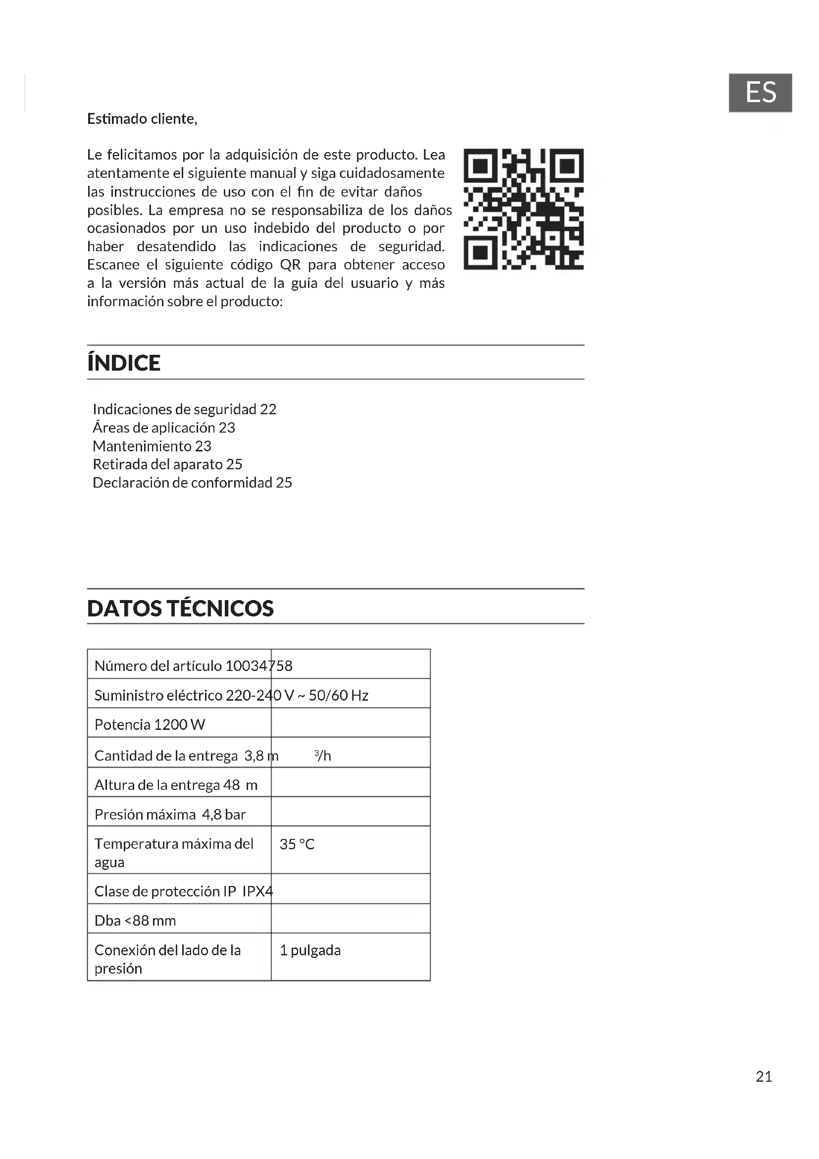 Indicaciones de seguridad 22 Áreas de aplicación 23 Mantenimiento 23 Retirada del aparato 25 Declaración de conformidad 25 Esmado cliente, Le felicitamos por la adquisición de este producto. Lea atentamente el siguiente manual y siga cuidadosamente las instrucciones de uso con el n de evitar daños posibles. La empresa no se responsabiliza de los daños ocasionados por un uso indebido del producto o por haber desatendido las indicaciones de seguridad. Escanee el siguiente código QR para obtener acceso a la versión más actual de la guía del usuario y más información sobre el producto:
