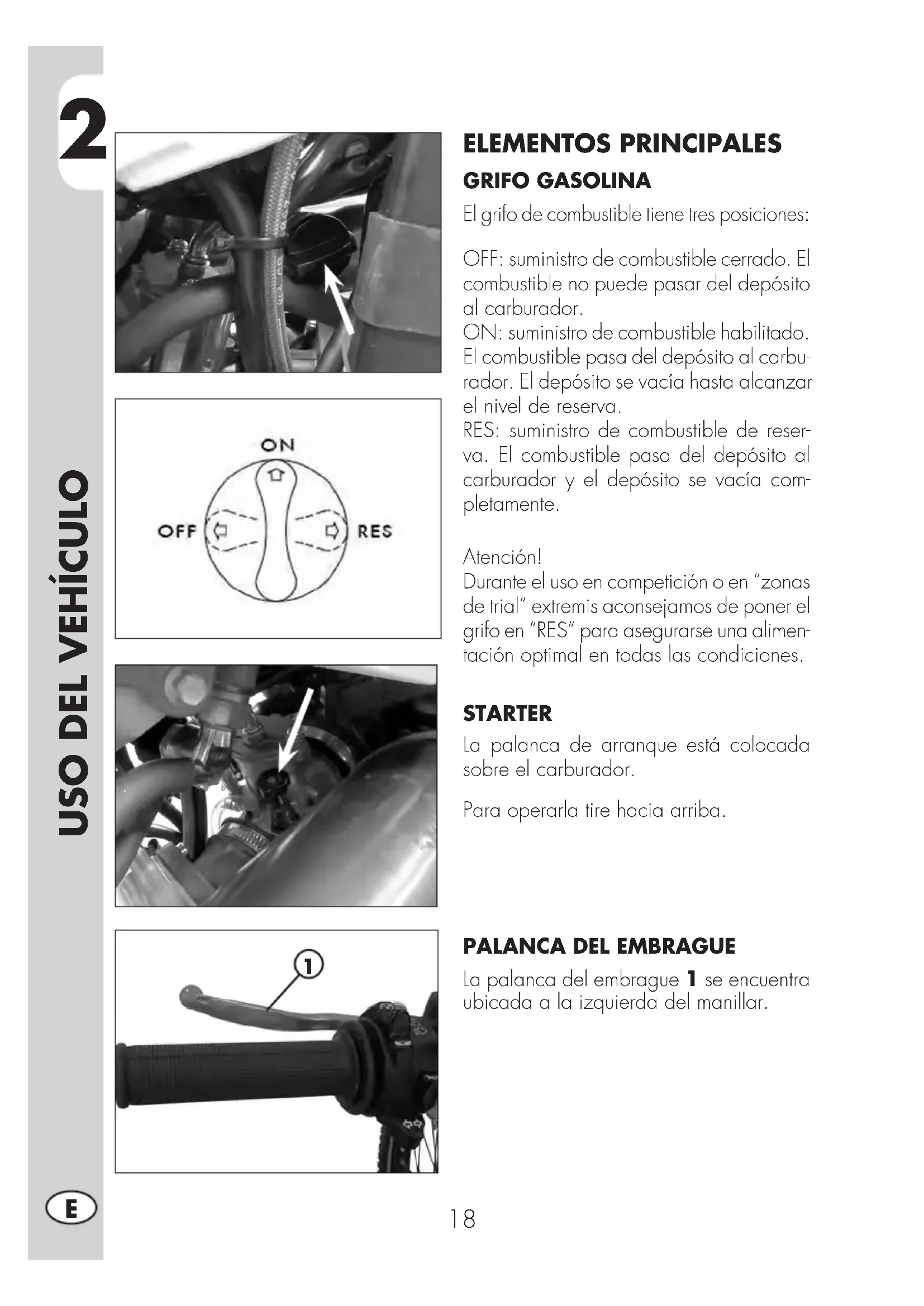 ELEMENTOS PRINCIPALES GRIFO GASOLINA El grifo de combustible tiene tres posiciones: OFF: suministro de combustible cerrado. El combustible no puede pasar del depósito al carburador. ON: suministro de combustible habilitado. El combustible pasa del depósito al carbu- rador. El depósito se vacía hasta alcanzar el nivel de reserva. RES: suministro de combustible de reser- va. El combustible pasa del depósito al carburador y el depósito se vacía com- pletamente. Atención! Durante el uso en competición o en “zonas de trial” extremis aconsejamos de poner el grifo en “RES” para asegurarse una alimen- tación optimal en todas las condiciones. STARTER La palanca de arranque está colocada sobre el carburador. Para operarla tire hacia arriba.