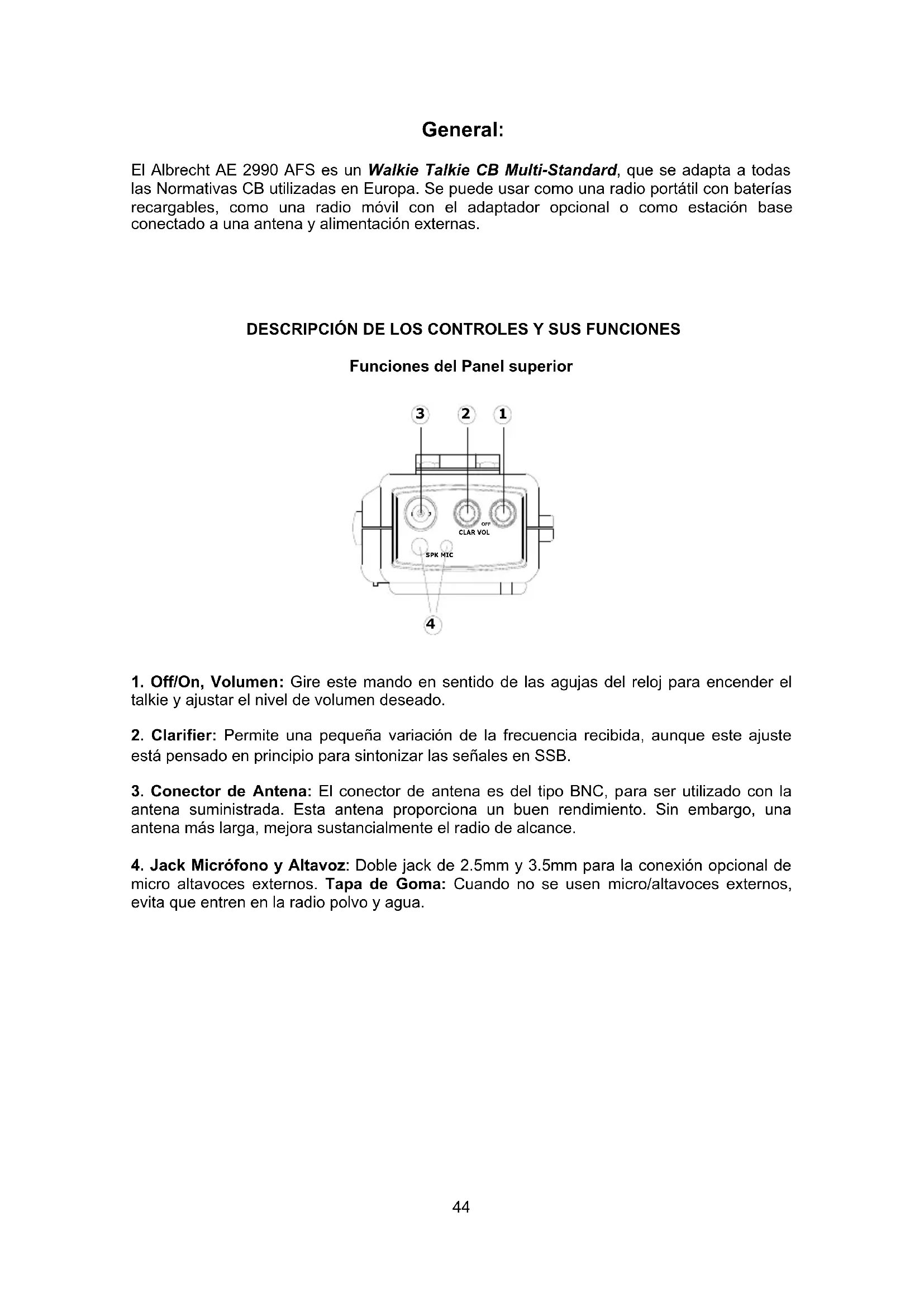 Manual del Usuario44 General: El Albrecht AE 2990 AFS es un Walkie Talkie CB Multi-Standard, que se adapta a todas las Normativas CB utilizadas en Europa. Se puede usar como una radio portátil con baterías recargables, como una radio móvil con el adaptador opcional o como estación base conectado a una antena y alimentación externas.