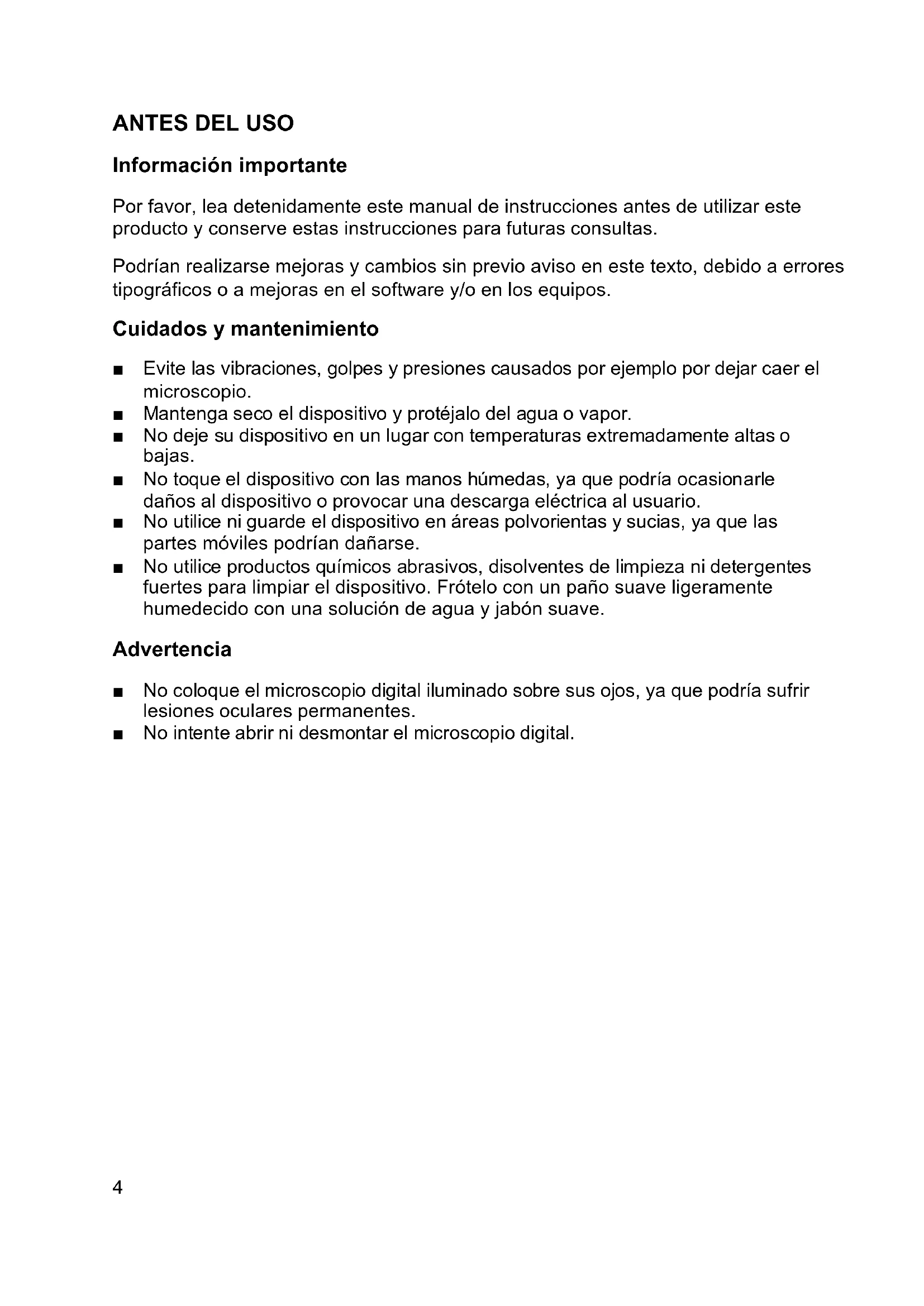 Información importante Por favor, lea detenidamente este manual de instrucciones antes de utilizar este producto y conserve estas instrucciones para futuras consultas. Podrían realizarse mejoras y cambios sin previo aviso en este texto, debido a errores tipográficos o a mejoras en el software y/o en los equipos. Cuidados y mantenimiento ■ Evite las vibraciones, golpes y presiones causados por ejemplo por dejar caer el microscopio. ■ Mantenga seco el dispositivo y protéjalo del agua o vapor. ■ No deje su dispositivo en un lugar con temperaturas extremadamente altas o bajas. ■ No toque el dispositivo con las manos húmedas, ya que podría ocasionarle daños al dispositivo o provocar una descarga eléctrica al usuario. ■ No utilice ni guarde el dispositivo en áreas polvorientas y sucias, ya que las partes móviles podrían dañarse. ■ No utilice productos químicos abrasivos, disolventes de limpieza ni detergentes fuertes para limpiar el dispositivo. Frótelo con un paño suave ligeramente humedecido con una solución de agua y jabón suave. Advertencia ■ No coloque el microscopio digital iluminado sobre sus ojos, ya que podría sufrir lesiones oculares permanentes. ■ No intente abrir ni desmontar el microscopio digital.