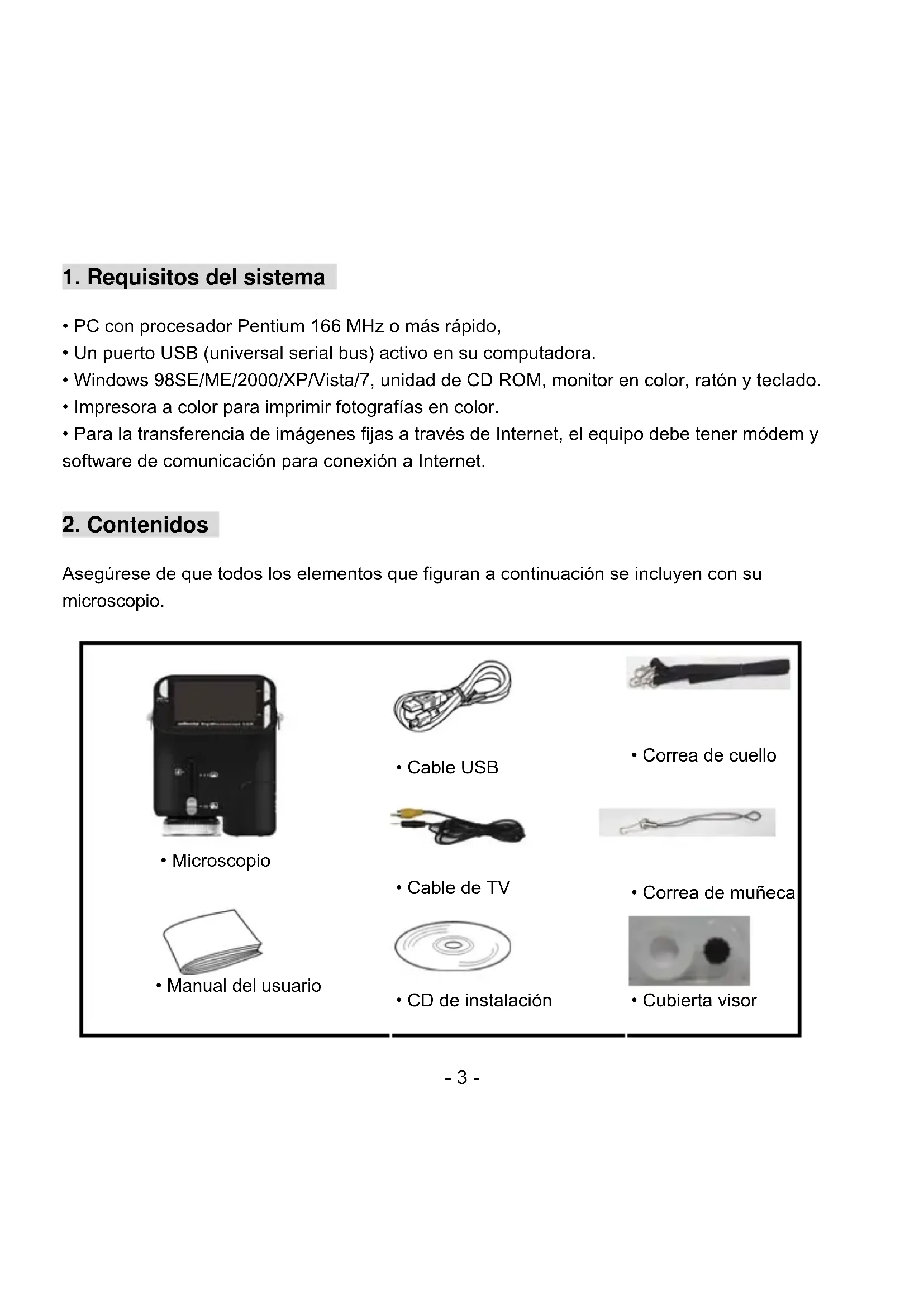 Manual del UsuarioPara clientes de Norte América y Sudamérica Para clientes de EE.UU. Este dispositivo cumple con la Parte 15 de las normas de la FCC. La operación está sujeta a las siguientes condiciones: (1) Este dispositivo no podrá causar interferencias perjudiciales. (2) Este dispositivo debe aceptar cualquier interferencia recibida, incluyendo interferencias que pueda provocar un funcionamiento no deseado. Para clientes de Canadá Este aparato digital Clase B cumple todos los requisitos de las regulaciones canadienses sobre equipos que causan interferencias. Para clientes de Europa La marca "CE" indica que este producto cumple con los requisitos europeos de seguridad, salud, medio ambiente y protección del cliente. Los microscopios con la marca ”CE" están destinados para su venta en Europa. - 1 -Tabla de Contenidos Página