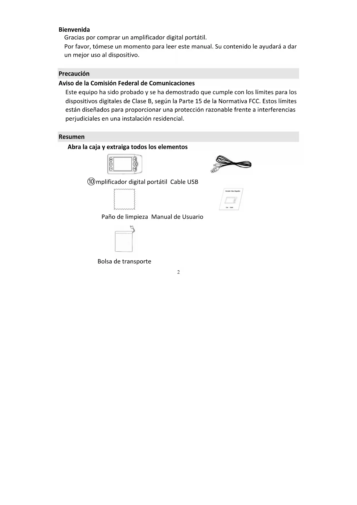 adecúe a sus necesidades para cambiar los colores usados en la pantalla. Usar el amplificador Selección del Modo de color Pulse el botón Modo de color para alternar entre los 3 modos de color diferentes del amplificador, a saber: A todo color Imagen mejorada en positivo (negro sobre blanco) Imagen mejorada en negativo (blanco sobre negro) Ajuste de aumento Pulse el botón Aumento para alternar entre los cuatro niveles de aumentos 5X, 6X, 7,5X or 10X. Fijar imagen Pulse el botón Fijar/liberar para fijar o liberar la imagen actual. Hacer fotos Introduzca una tarjeta microSD (no incluida) en la ranura de tarjeta microSD. Pulse el botón Instantánea para hacer una foto. Las fotos capturadas se almacenarán automáticamente en la tarjeta microSD.7 Reproducción Pulse el botón Reproducción para ver las imágenes captaradas. Pulse el botón Retroceder y Avanzar para retroceder y avanzar. Pulse otra vez el botón Reproducción para devolver al amplificador al modo de lectura. Descargar las imágenes capturadas al PC Conecte el amplificador al PC conectando el cable USB al puerto USB, enciéndalo y podrá descargar las imágenes capturadas al ordenador. Indicación de batería baja Si el nivel de batería es bajo, aparecerá un icono (blanco) en la esquina inferior derecha de la pantalla, indicando que debe sustituir las pilas por unas nuevas.8