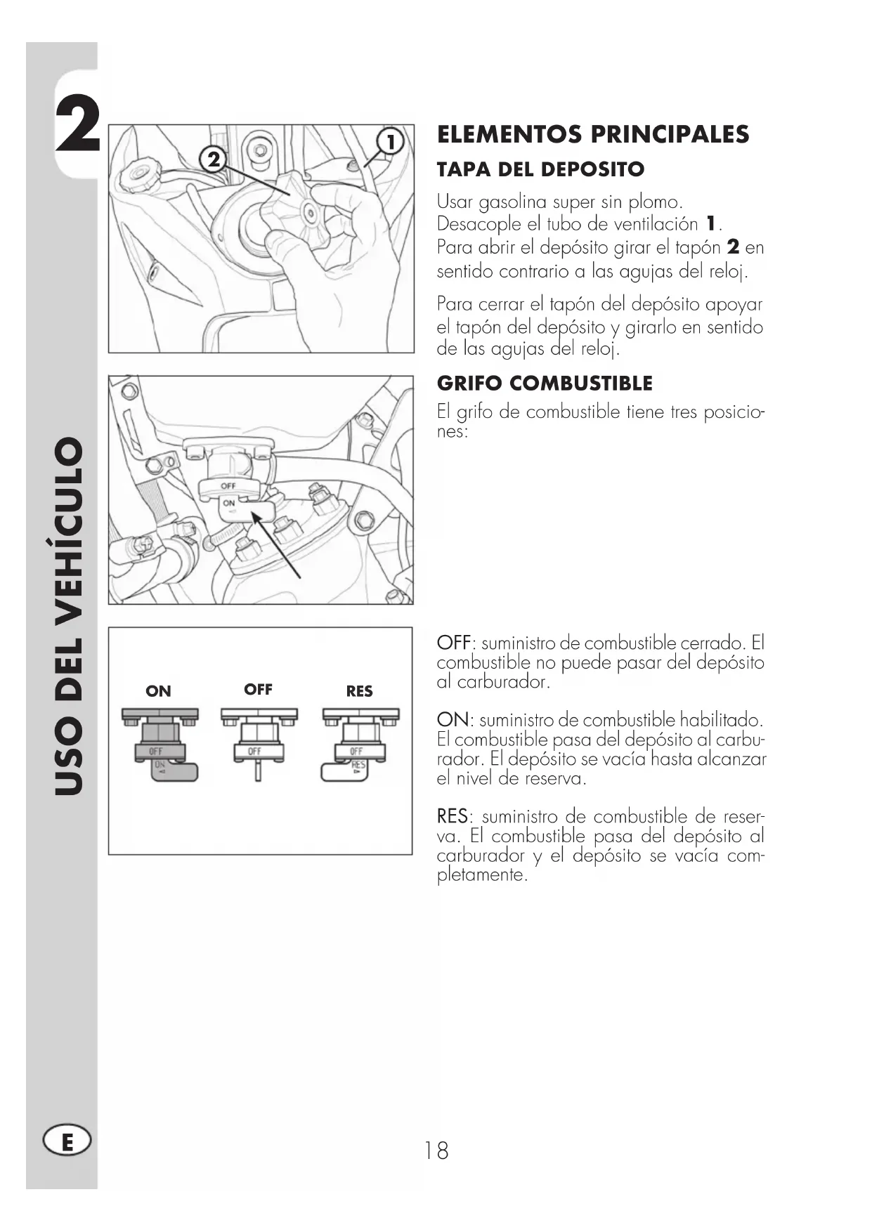 Usar gasolina super sin plomo. Desacople el tubo de ventilación 1. Para abrir el depósito girar el tapón 2 en sentido contrario a las agujas del reloj. Para cerrar el tapón del depósito apoyar el tapón del depósito y girarlo en sentido de las agujas del reloj. GRIFO COMBUSTIBLE El grifo de combustible tiene tres posicio- nes: OFF: suministro de combustible cerrado. El combustible no puede pasar del depósito al carburador. ON: suministro de combustible habilitado. El combustible pasa del depósito al carbu- rador. El depósito se vacía hasta alcanzar el nivel de reserva. RES: suministro de combustible de reser- va. El combustible pasa del depósito al carburador y el depósito se vacía com- pletamente.