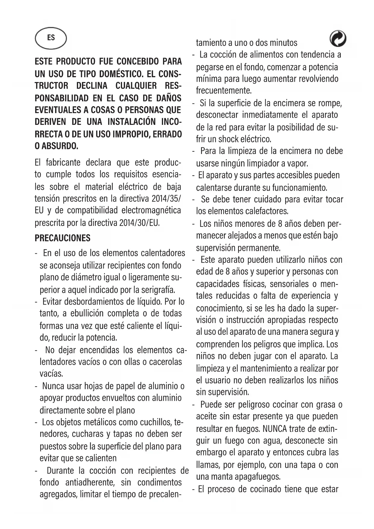 RRECTA O DE UN USO IMPROPIO, ERRADO O ABSURDO. El fabricante declara que este produc- to cumple todos los requisitos esencia- les sobre el material eléctrico de baja tensión prescritos en la directiva 2014/35/ EU y de compatibilidad electromagnética prescrita por la directiva 2014/30/EU. PRECAUCIONES - En el uso de los elementos calentadores se aconseja utilizar recipientes con fondo plano de diámetro igual o ligeramente su- perior a aquel indicado por la serigrafía. - Evitar desbordamientos de líquido. Por lo tanto, a ebullición completa o de todas formas una vez que esté caliente el líqui- do, reducir la potencia. - No dejar encendidas los elementos ca- lentadores vacíos o con ollas o cacerolas vacías. - Nunca usar hojas de papel de aluminio o apoyar productos envueltos con aluminio directamente sobre el plano - Los objetos metálicos como cuchillos, te- nedores, cucharas y tapas no deben ser puestos sobre la superficie del plano para evitar que se calienten - Durante la cocción con recipientes de fondo antiadherente, sin condimentos agregados, limitar el tiempo de precalen- tamiento a uno o dos minutos - La cocción de alimentos con tendencia a pegarse en el fondo, comenzar a potencia mínima para luego aumentar revolviendo frecuentemente. - Si la superficie de la encimera se rompe, desconectar inmediatamente el aparato de la red para evitar la posibilidad de su- frir un shock eléctrico. - Para la limpieza de la encimera no debe usarse ningún limpiador a vapor. - El aparato y sus partes accesibles pueden calentarse durante su funcionamiento. - Se debe tener cuidado para evitar tocar los elementos calefactores. - Los niños menores de 8 años deben per- manecer alejados a menos que estén bajo supervisión permanente. - Este aparato pueden utilizarlo niños con edad de 8 años y superior y personas con capacidades físicas, sensoriales o men- tales reducidas o falta de experiencia y conocimiento, si se les ha dado la super- visión o instrucción apropiadas respecto al uso del aparato de una manera segura y comprenden los peligros que implica. Los niños no deben jugar con el aparato. La limpieza y el mantenimiento a realizar por el usuario no deben realizarlos los niños sin supervisión. - Puede ser peligroso cocinar con grasa o aceite sin estar presente ya que pueden resultar en fuegos. NUNCA trate de extin- guir un fuego con agua, desconecte sin embargo el aparato y entonces cubra las llamas, por ejemplo, con una tapa o con una manta apagafuegos. - El proceso de cocinado tiene que estar ESsupervisado. Un proceso de cocinado de corta duración debe ser supervisado con- tinuamente. - Una cocción desatendida con grasa o aceite puede ser peligrosa y podría cau- sar un incendio. - Peligro de fuego: no almacenar elementos en las superficies de cocción. - Utilizar sólo protectores de encimera di- señados por el fabricante del aparato de cocción o indicado por el fabricante en las instrucciones para el uso como adecuado o protectores de encimera incorporados en el aparato. El uso de protectores inade- cuados puede causar accidentes. Instale en el cableado fijo un medio de des- conexión de la red eléctrica con una sepa- ración de contacto en todos los polos que permita una desconexión completa en con- diciones de sobretensión de categoría III, de acuerdo con la normativa de cableado. El enchufe o el interruptor omnipolar tienen que ser fácilmente alcanzables con el apa- rato instalado. Este aparato no está previsto para hacerlo funcionar por medio de un temporizador externo o sistema de control remoto sepa- rado. El constructor declina cualquier responsa- bilidad en el caso de que lo dicho arriba y las usuales normas contra los infortunios no sean respetados. Si el cable de alimentación se daña, hágalo sustituir por el fabricante, por un centro de asistencia técnica autorizado o por un téc- nico de competencia similar, a fin de preve- nir todo tipo de riesgos. Instrucciones para el usuario Instalación Todas las operaciones relativas a la instalación (conexión eléctri- ca) tienen que ser efectuadas por personal cualificado según las normas vigentes. Para las instrucciones específicas véase la parte reservada al instalador. Utilización