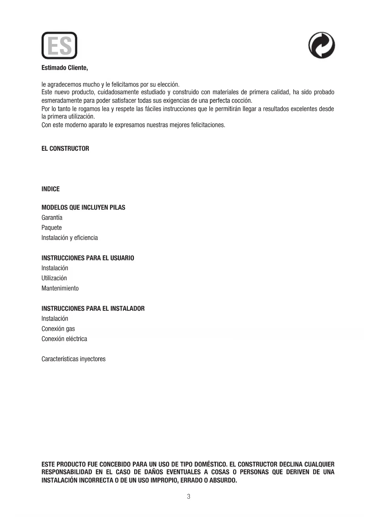 Instalación Conexión gas Conexión eléctrica Características inyectores ESTE PRODUCTO FUE CONCEBIDO PARA UN USO DE TIPO DOMÉSTICO. EL CONSTRUCTOR DECLINA CUALQUIER RESPONSABILIDAD EN EL CASO DE DAÑOS EVENTUALES A COSAS O PERSONAS QUE DERIVEN DE UNA INSTALACIÓN INCORRECTA O DE UN USO IMPROPIO, ERRADO O ABSURDO. ES4