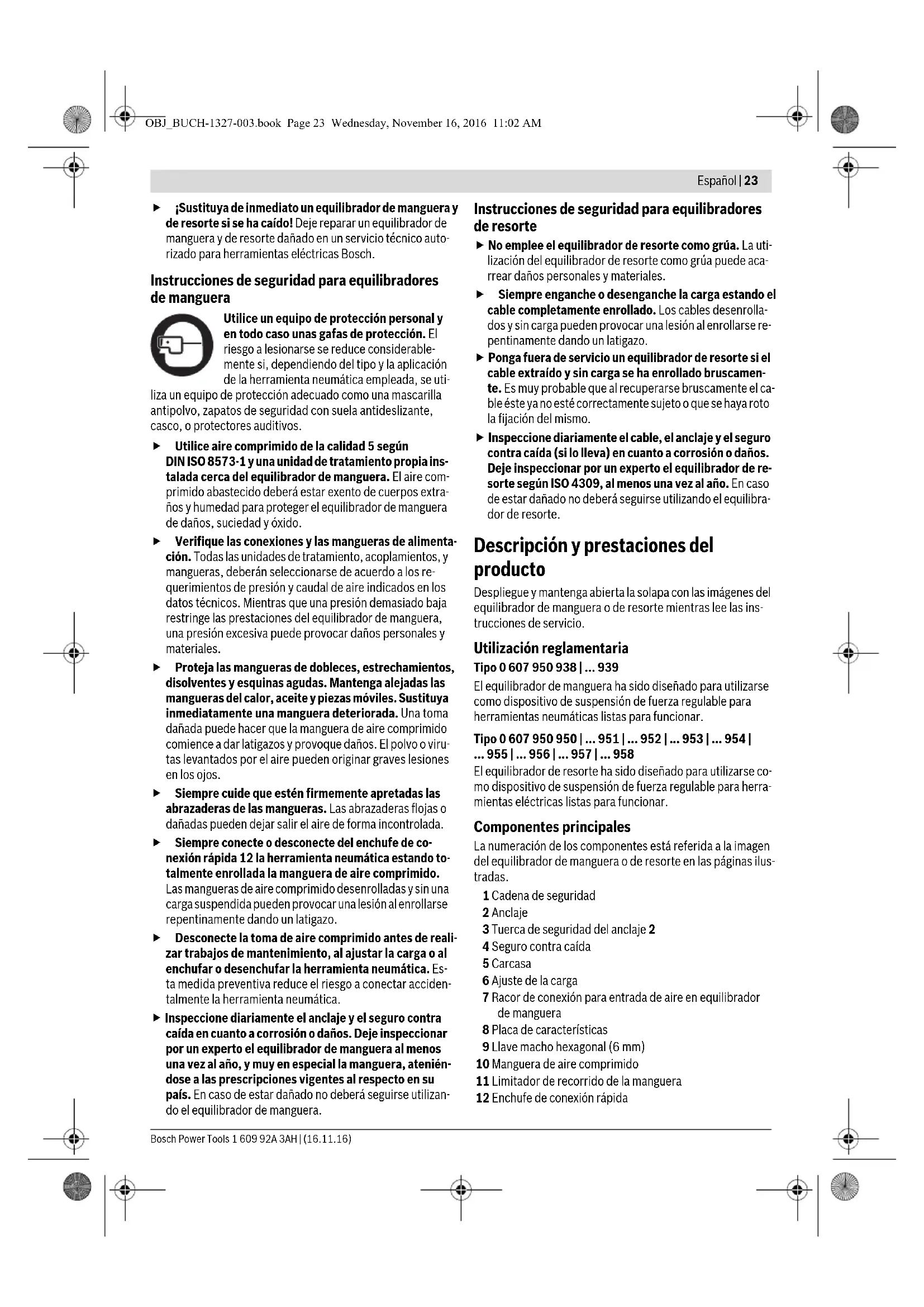 - , fijándola al gancho de carga 27 y asegurándola a continuación enroscando la tuerca de seguridad. El ajuste correcto de la carga es aquel en el que la herramienta suspendida puede guiarse fácilmente hacia la posición desea- da, retornando fácilmente de nuevo a la posición de partida al soltarla. Tipo 0 607 950 950 | p. 951