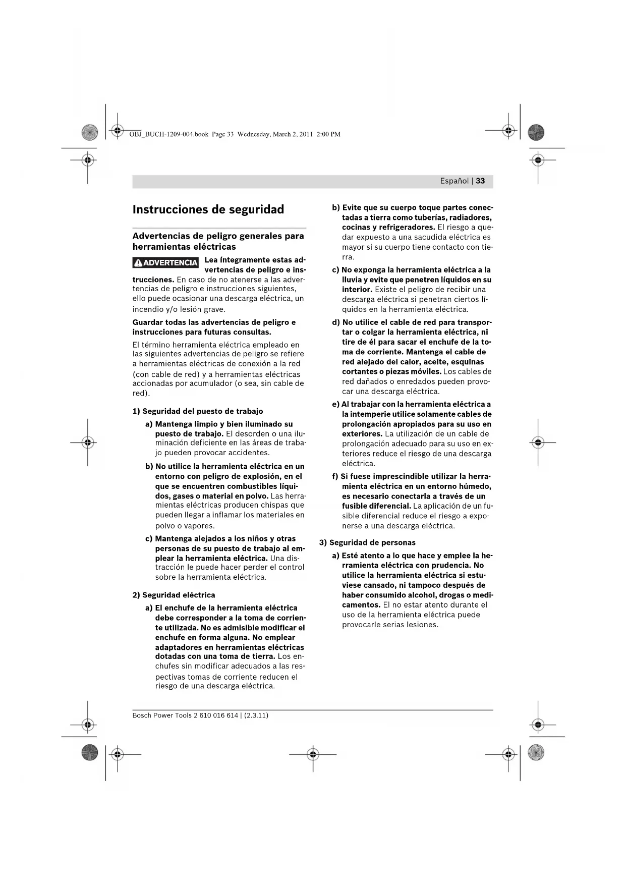 eléctricas a) No sobrecargue la herramienta eléctrica. Use la herramienta eléctrica prevista pa- ra el trabajo a realizar. Con la herramien- ta adecuada podrá trabajar mejor y más seguro dentro del margen de potencia in- dicado. b) No utilice herramientas eléctricas con un interruptor defectuoso. Las herramien- tas eléctricas que no se puedan conectar o desconectar son peligrosas y deben ha- cerse reparar. c) Saque el enchufe de la red y/o desmonte el acumulador antes de realizar un ajuste en la herramienta eléctrica, cambiar de accesorio o al guardar la herramienta eléctrica. Esta medida preventiva reduce el riesgo a conectar accidentalmente la herramienta eléctrica. d) Guarde las herramientas eléctricas fuera del alcance de los niños. No permita la utilización de la herramienta eléctrica a aquellas personas que no estén familiari- zadas con su uso o que no hayan leído estas instrucciones. Las herramientas eléctricas utilizadas por personas inex- pertas son peligrosas. e) Cuide la herramienta eléctrica con esme- ro. Controle si funcionan correctamente, sin atascarse, las partes móviles de la herramienta eléctrica, y si existen partes rotas o deterioradas que pudieran afec- tar al funcionamiento de la herramienta eléctrica. Haga reparar estas piezas de- fectuosas antes de volver a utilizar la he- rramienta eléctrica. Muchos de los acci- dentes se deben a herramientas eléctricas con un mantenimiento deficien- te. f) Mantenga los útiles limpios y afilados. Los útiles mantenidos correctamente se dejan guiar y controlar mejor. OBJ_BUCH-1209-004.book Page 34 Wednesday, March 2, 2011 2:00 PMEspañol | 35 Bosch Power Tools 2 610 016 614 | (2.3.11) g) Utilice la herramienta eléctrica, acceso- rios, útiles, etc. de acuerdo a estas ins- trucciones, considerando en ello las con- diciones de trabajo y la tarea a realizar. El uso de herramientas eléctricas para tra- bajos diferentes de aquellos para los que han sido concebidas puede resultar peli- groso.