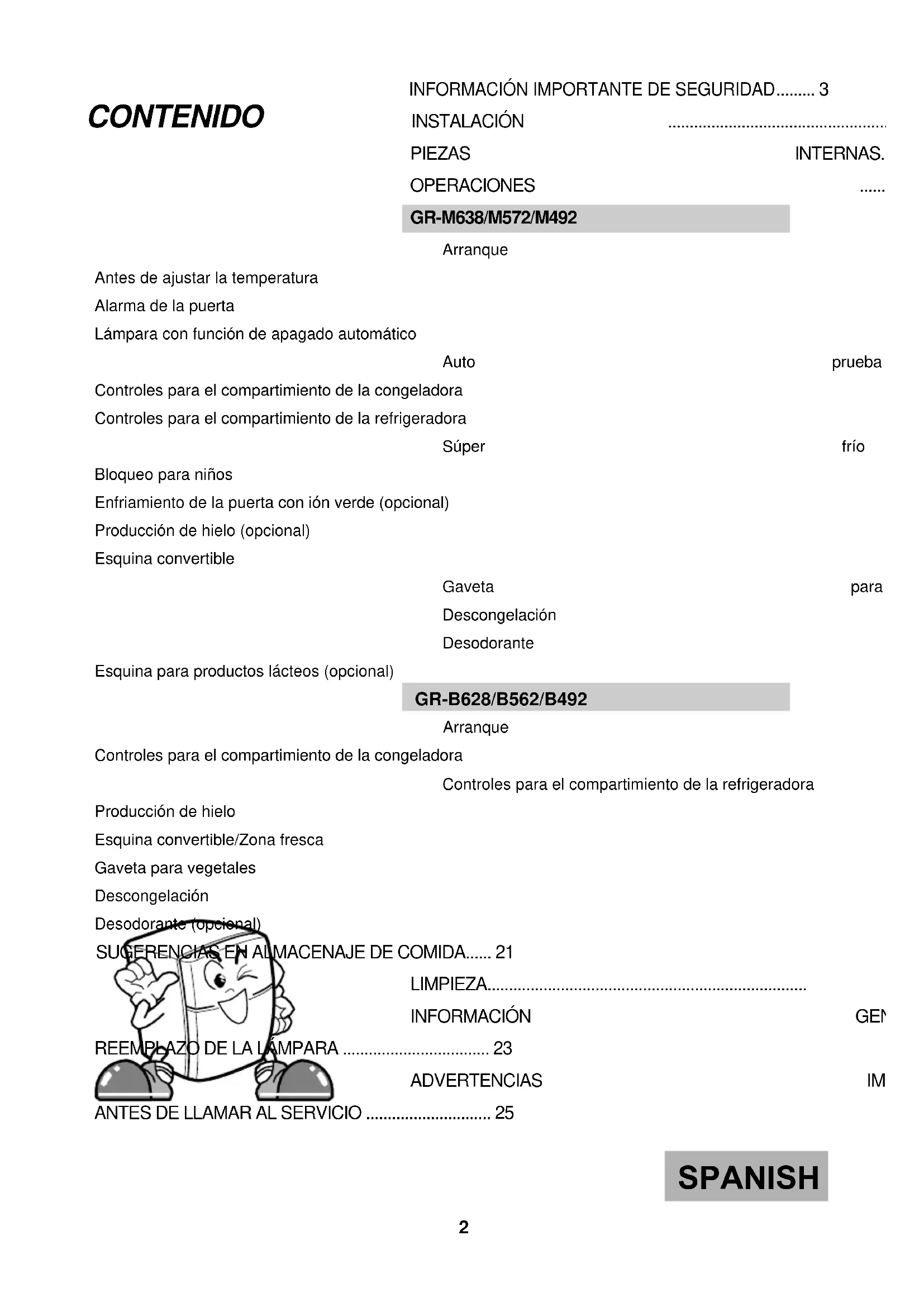 CONTENIDO INSTALACIÓN ................................................................... 9 PIEZAS INTERNAS......................................................... 10 OPERACIONES .............................................................. 11 GR-M638/M572/M492 Arranque Antes de ajustar la temperatura Alarma de la puerta Lámpara con función de apagado automático Auto prueba Controles para el compartimiento de la congeladora Controles para el compartimiento de la refrigeradora Súper frío Bloqueo para niños Enfriamiento de la puerta con ión verde (opcional) Producción de hielo (opcional) Esquina convertible Gaveta para vegetales Descongelación Desodorante (opcional) Esquina para productos lácteos (opcional)