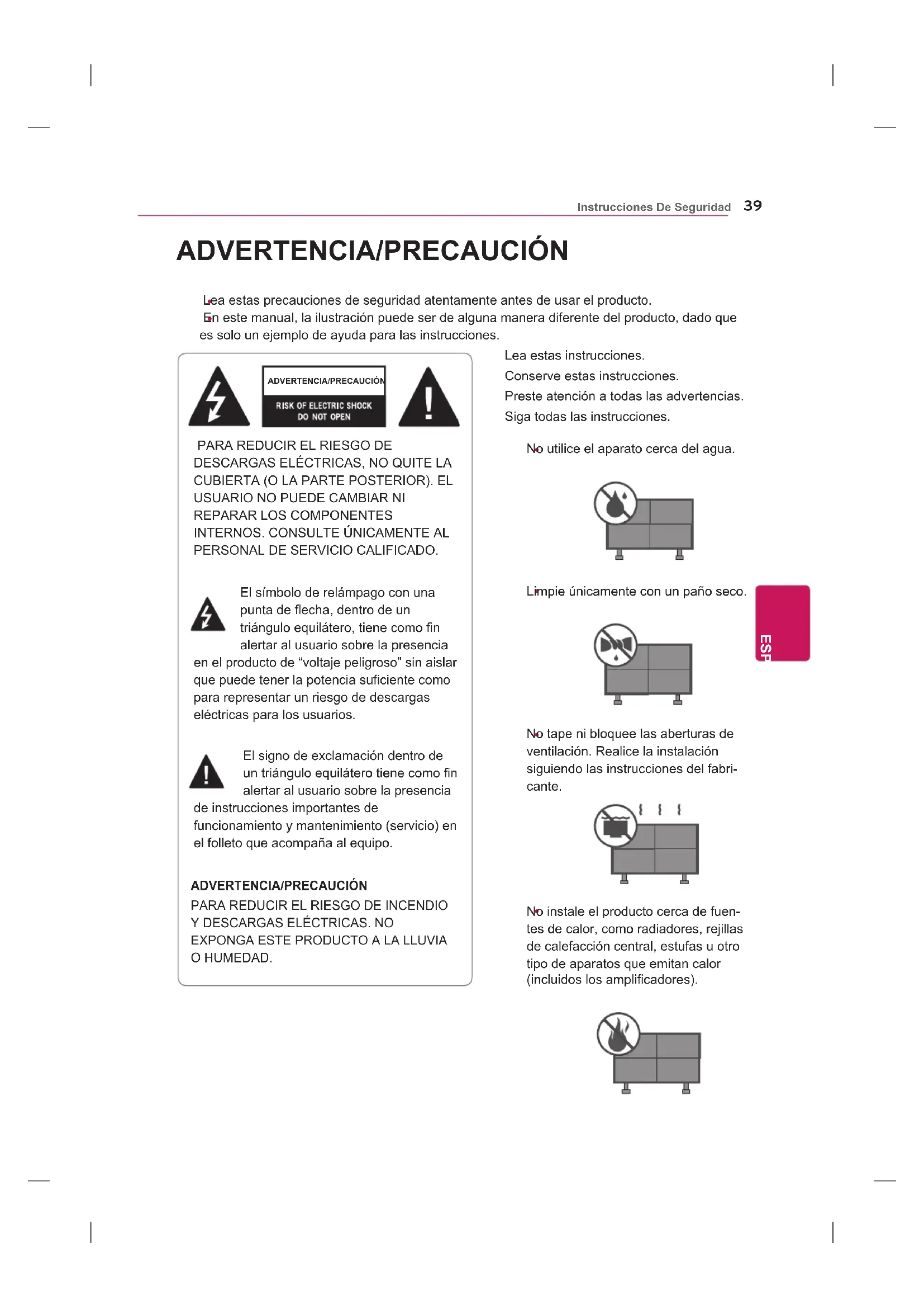 ADVERTENCIA: para disminuir los riesgos de incendios o descargas eléctricas, no exponga el producto a la lluvia, la humedad u otro tipo de líquidos. No toque el moni- tor con las manos mojadas. No instale el producto cerca de objetos inflamables como combustible o velas, ni lo exponga al aire acondicionado directo.