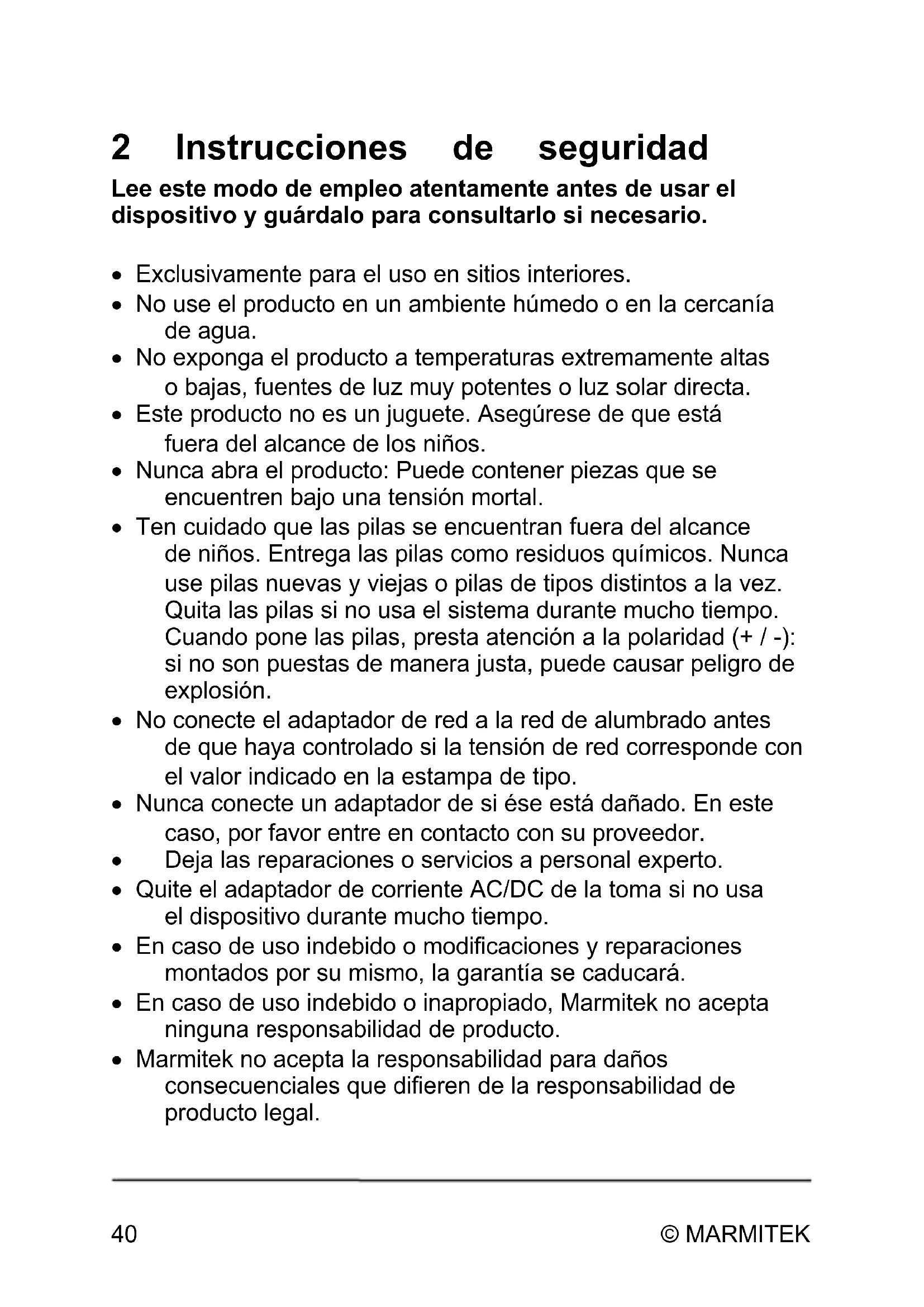 Información medioambiental para clientes de la Unión Europea. La Directiva 2002/96/CE de la UE exige que los equipos que lleven este símbolo en el propio aparato y/o en su embalaje no deben eliminarse junto con otros residuos urbanos no seleccionados. El símbolo indica que el producto en cuestión debe separarse de los residuos domésticos convencionales con vistas a su eliminación. Es responsabilidad suya desechar este y cualesquiera otros aparatos eléctricos y electrónicos a través de los puntos de recogida que ponen a su disposición el gobierno y las autoridades locales. Al desechar y© MARMITEK