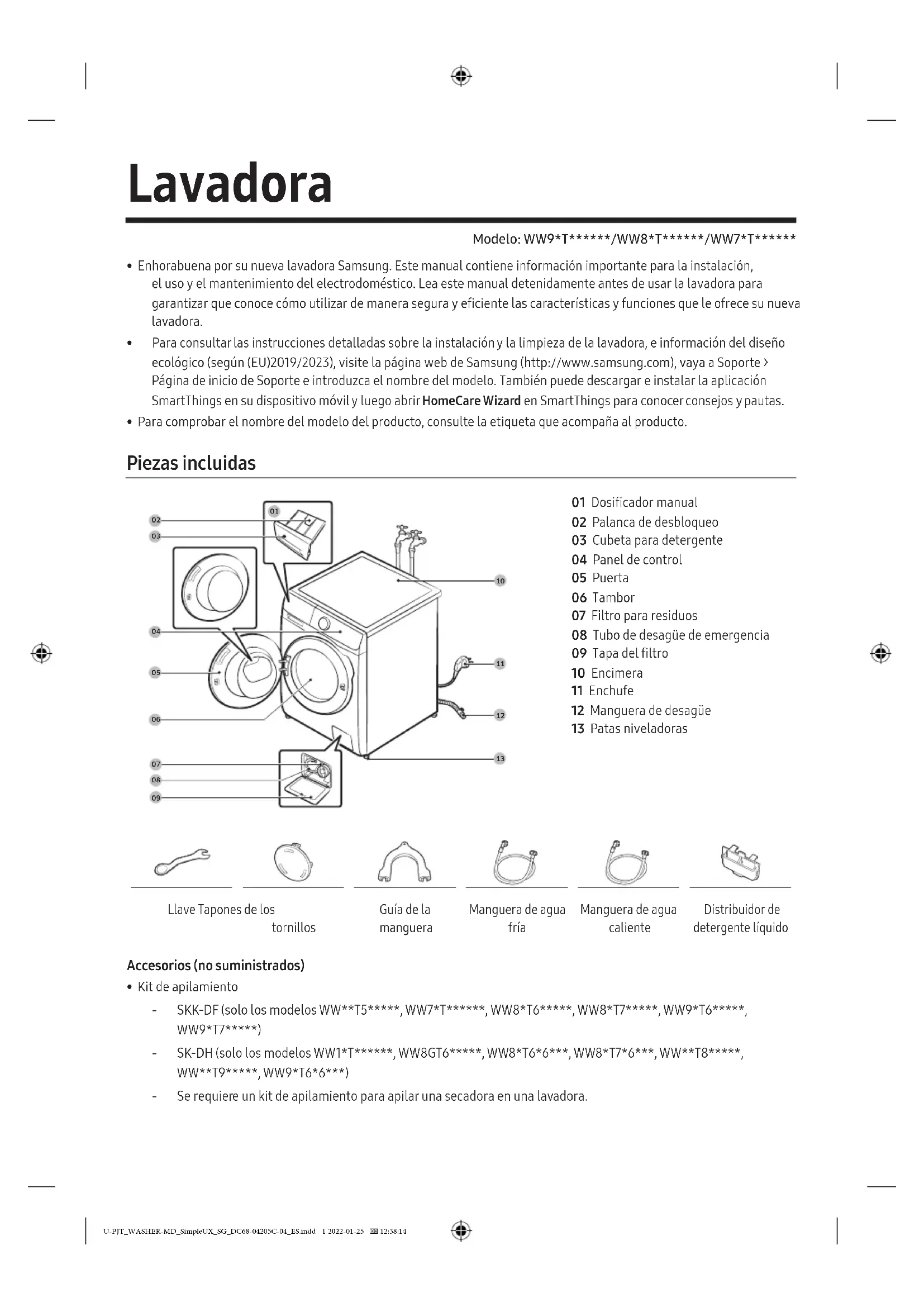 - Para consultar las instrucciones detalladas sobre la instalación y la limpieza de la lavadora, e información del diseño ecológico (según (EU)2019/2023), visite la página web de Samsung (http://www.samsung.com), vaya a Soporte > Página de inicio de Soporte e introduzca el nombre del modelo. También puede descargar e instalar la aplicación SmartThings en su dispositivo móvil y luego abrir HomeCare Wizard en SmartThings para conocer consejos y pautas.