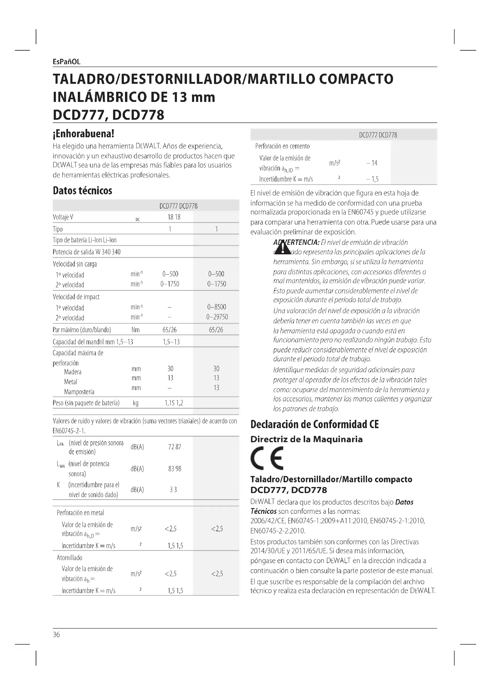 ADVERTENCIA: El nivel de emisión de vibración declarado representa las principales aplicaciones de la herramienta. Sin embargo, si se utiliza la herramienta para distintas aplicaciones, con accesorios diferentes o mal mantenidos, la emisión de vibración puede variar. Esto puede aumentar considerablemente el nivel de exposición durante el período total detrabajo. Una valoración del nivel de exposición a la vibración debería tener en cuenta también las veces en que la herramienta está apagada o cuando está en funcionamiento pero no realizando ningún trabajo. Esto puede reducir considerablemente el nivel de exposición durante el periodo total detrabajo. Identifique medidas de seguridad adicionales para proteger al operador de los efectos de la vibración tales como: ocuparse del mantenimiento de la herramienta y los accesorios, mantener las manos calientes y organizar los patrones detrabajo. Declaración de Conformidad CE Directriz de la Maquinaria Taladro/Destornillador/Martillo compacto DCD777, DCD778 DeWALT declara que los productos descritos bajo Datos Técnicos son conformes a las normas: 2006/42/CE, EN60745-1:2009+A11:2010, EN60745-2-1:2010, EN60745-2-2:2010. Estos productos también son conformes con las Directivas 2014/30/UE y 2011/65/UE. Si desea más información, póngase en contacto con DeWALT en la dirección indicada a continuación o bien consulte la parte posterior de estemanual. El que suscribe es responsable de la compilación del archivo técnico y realiza esta declaración en representación de DeWALT