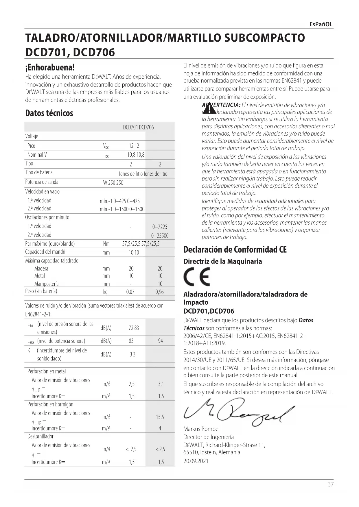 - Li-Ion cells are recyclable. Take them to your dealer or a local recycling station. The collected battery packs will be recycled or disposed ofproperly.37 EsPañOL Declaración de Conformidad CE Directriz de la Maquinaria Aladradora/atornilladora/taladradora de Impacto DCD701, DCD706 DeWALT declara que los productos descritos bajo Datos Técnicos son conformes a las normas: 2006/42/CE, EN62841-1:2015+AC:2015, EN62841-2- 1:2018+A11:2019. Estos productos también son conformes con las Directivas 2014/30/UE y 2011/65/UE. Si desea más información, póngase en contacto con DeWALT en la dirección indicada a continuación o bien consulte la parte posterior de estemanual. El que suscribe es responsable de la compilación del archivo técnico y realiza esta declaración en representación de DeWALT. Markus Rompel Director de Ingeniería DeWALT, Richard-Klinger-Strase 11, 65510, Idstein, Alemania