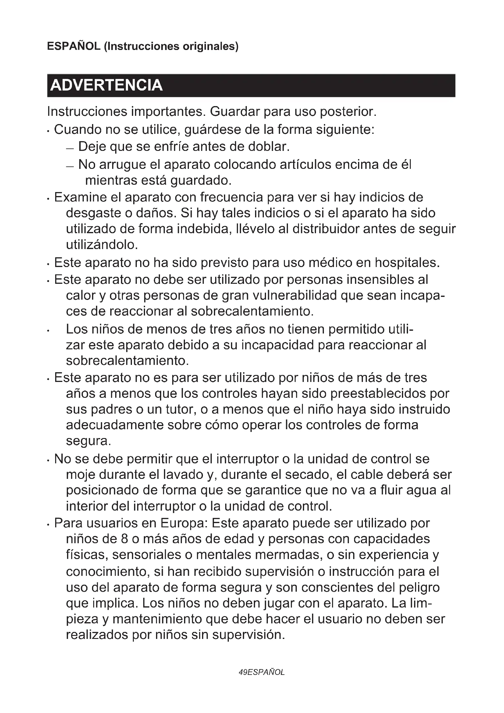 - El cartucho de batería puede variar de un país a otro. Símbolos Algunos de los símbolos siguientes se utilizan para el producto. Asegúrese de entender sus signicados antes de la utilización. Lea el manual de instrucciones. Lavar a máquina a menos de 30°C en ciclo delicado. No usar lejía. No escurrir. No planchar. No lavar en seco. No es para ser utilizado por niños muy pequeños (0-3 años). No insertar imperdibles. Secar a máquina con poco calor. Secado al aire libre. Aparato de Clase III. Sólo para países de la Unión Europea Desecho correcto de este producto Esta marca indica que este producto no debe ser desechado junto con otros resi- duos domésticos en toda la UE. Para evitar posibles daños al medioambiente o a la salud de las personas debidos al desecho incontrolado de los residuos, recíclelo responsablemente con objeto de impulsar la reutilización sostenible de los recursos materiales. Para retornar su dispositivo usado, por favor, utilice los sistemas de retorno y recogida o póngase en contacto con el vendedor donde fue comprado el producto. Ellos pueden aceptar este producto para su reciclado respetuoso con el medioambiente de forma segura. Debido a la presencia de componentes peligrosos en el equipo, el equipo eléctrico y electrónico desechado puede tener un impacto negativo para el medioambiente y la salud humana. Uso previsto Este aparato ha sido previsto para calentar el cuerpo en ambientes fríos.52 ESPAÑOL ADVERTENCIAS DE SEGURIDAD ADVERTENCIA: Lea todas las advertencias de seguridad y todas las instrucciones. Si no sigue las advertencias e instrucciones podrá resultar en una descarga eléctrica, un incendio y/o heridas graves. Guarde todas las advertencias e instrucciones para futuras referencias. El término “aparato” en las advertencias y precauciones se reere a la cobija y el portabatería con el cartucho de batería. Advertencias de seguridad generales