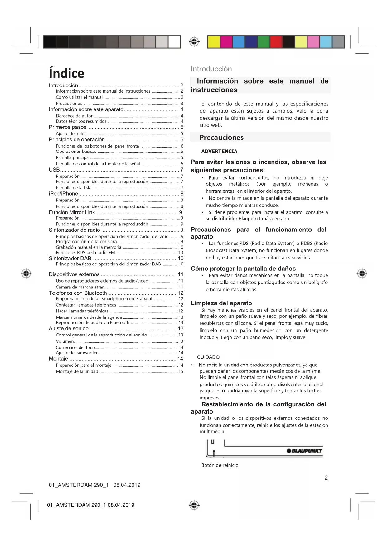 with 6.75 inch TFT panel Enjoy it. en Operating and installation instructions Subject to change and technical modication01_AMSTERDAM 290_1 08.04.2019 01_AMSTERDAM 290_1 08.04.2019 Declaración de conformidad Blaupunkt Competence Center Car Multimedia-Evo Sales GmbH por la presente declara que este dispositivo cumple con los requisitos esenciales y otras disposiciones pertinentes de la Directiva 2014/53/UE. La declaración de conformidad se encuentra en www.blaupunkt.com Indicaciones para la limpieza del aparato Los disolventes, agentes limpiadores y abrasivos, así como los limpiadores de cabina y los productos para el cuidado de plásticos pueden contener componentes que puedan dañar la superficie de la unidad. ♦ Limpie el aparato con un paño seco o ligeramente húmedo. ♦ Si es necesario, limpie los contactos del panel de control con un paño suave empapado en detergente a base de alcohol. Eliminación del aparato ¡No elimine el aparato usado junto con la basura doméstica! Deseche el aparato viejo devolviéndolo al punto de recogida de residuos eléctricos y electrónicos. Información sobre este aparato Derechos de autor