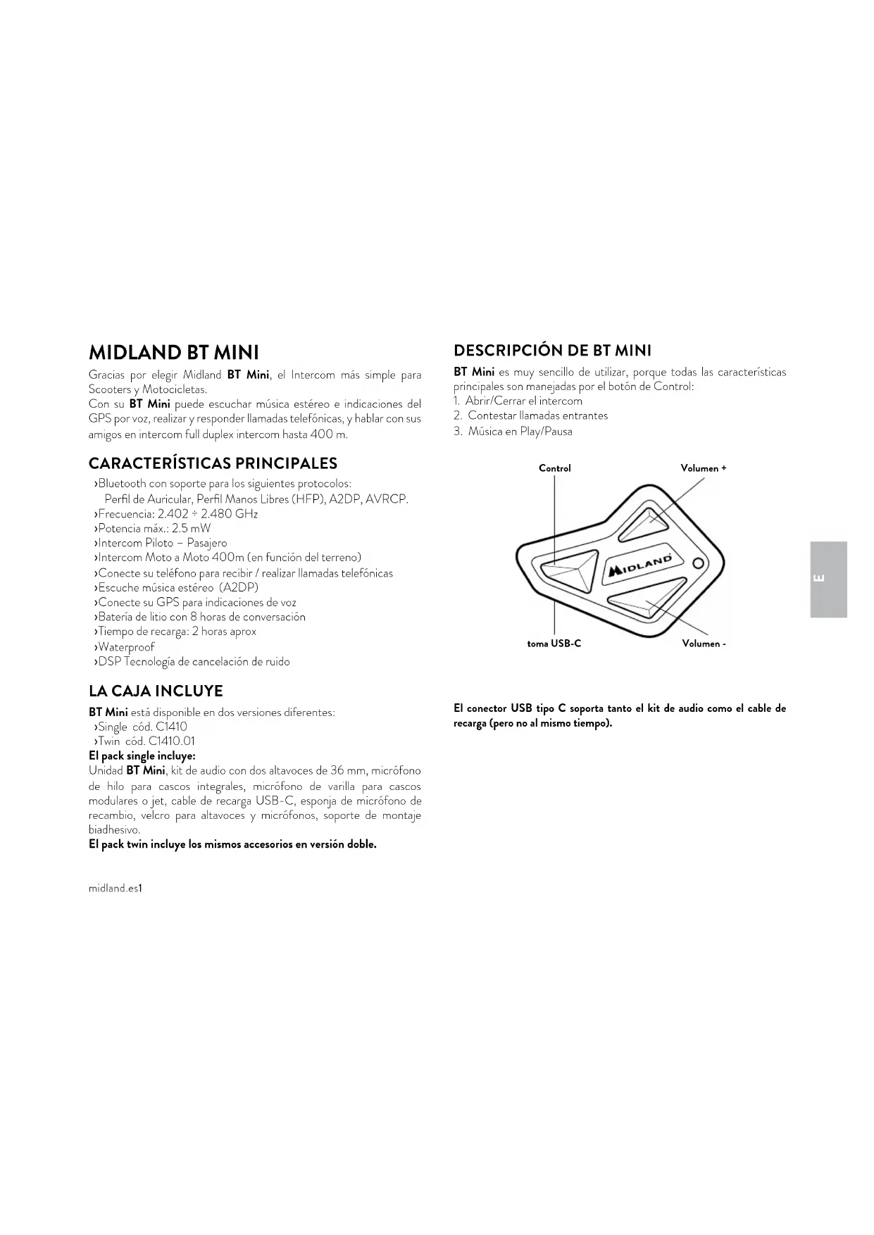 Midland BT Mini es un sistema intercomunicación full duplex para la comunicación piloto-pasajero y moto a moto hasta una distancia de 400m (en función de las condiciones del terreno). Además, puede escuchar música estéreo, realizar y responder llamadas telefónicas o recibir indicaciones de voz desde el GPS. Si durante la comunicación entra una llamada, el intercom se cierra y se abre de nuevo al finalizar la llamada. Si se abre el intercomunicador mientras está escuchando música, la música se detiene. Cuando el intercomunicador se cierra, la música se reanuda automáticamente. Si recibe una llamada telefónica mientras está escuchando música, la música se detiene. Cuando finaliza la llamada, la música se reanuda automáticamente. ATENCIÓN: Midland BT Mini responde automáticamente a una llamada entrante después de 8 seg. Puede desactivar esta función y responder manualmente a las llamadas entrantes. Activar autoresponder Vol+ y Vol- durante 5 seg. Voz: “Enable” Desactivar autoresponder Vol+ y Vol- durante 5 seg. Voz: “Disable” Funciones Básicas Encender Pulsación durante 1 seg. en los botones Control y Vol- Voz: “Power on” y “Battery status” Apagar Pulsación durante 1 seg. en los botones Control y Vol- Voz: “Power o” Ajuste de volumen Pulsación corta en Vol+ o Vol-, o mantenga pulsado Emparejar a un teléfono/GPS Emparejar desde BT Mini La unidad está apagada: Control durante 5 seg LED parpadea rojo y azul alternativamente Voz: “Pairing” cuando empieza, “Pairing successful” cuando termina Emparejar desde dispositivos Bluetooth (teléfono/GPS/ MP3) Busque los dispositivos Bluetooth en el teléfono o GPS y seleccione “Midland BT Mini” de la lista PIN (si se requiere) “0000” Cómo utilizar un teléfono Responder llamada Presión corta en el botón Control Terminar llamada Presión corta en el botón Control Rechazar llamada Control durante 3 seg mientras suenaE midland.es4 Marcación por voz Doble clic en el botón Control o Vol+ Rellamada Doble clic en el botón Vol- (voz: “Redial”) Cancelar rellamada Pulsación corta en el botón Control Función de respuesta automática Por defecto, la Respuesta automática está activa. BT Mini responderá automáticamente a una llamada entrante después de 8 segundos. Cómo usar un reproductor de música Play/Pausa Pulse 3 seg en el botón Control Canción hacia adelante Doble clic en Vol+ Canción hacia atrás Doble clic en Vol- Emparejar con otra unidad BT Mini Empezar el emparejamiento con ambas unidades BT Mini La unidad está en modo stand by, pulse Vol- 5 seg en ambas unidades, el LED rojo y azul parpadeará alternativamente Voz: “Pairing successful” cuando termina Cómo usar el intercom Abrir/Cerrar intercom Pulsación corta en el botón Control Emparejar otro Intercom Es posible emparejar BT Mini con otro modelo/marca solo si la otra unidad admite la función de Universal Intercom. BT Mini utilizará el emparejamiento a un teléfono para conectarse al Universal Intercom de la otra unidad. Emparejar desde BT Mini La unidad está apagada. Control durante 5 seg. LED rojo y azul parpadea alternativamente Empezar emparejamiento en el otro Intercom Siga los pasos descritos en “Emparejamiento Universal intercom” en la otra unidad Cómo usar el Universal Intercom Abrir/Cerrar Universal Intercom Doble clic en Control/Pulsación corta en Control Atención: es necesario repetir dos veces el proceso de Abrir: después de oír la voz “Device connected”, doble clic de nuevo en Control. Acciones Especiales Resetear todos los emparejamientos Unidad apagada: Vol- y Control durante 7 seg (LED azul por 3 seg) Cancelar emparejamiento Durante el emparejamiento, doble clic en Vol+ , Vol- o Control Activar respuesta automática Vol+ y Vol- por 5 seg (voz “Enable”) Desactivar respuesta automática Vol+ y Vol- por 5 seg (voz “Disable”)E midland.es 5 Voz/Beep/Luz