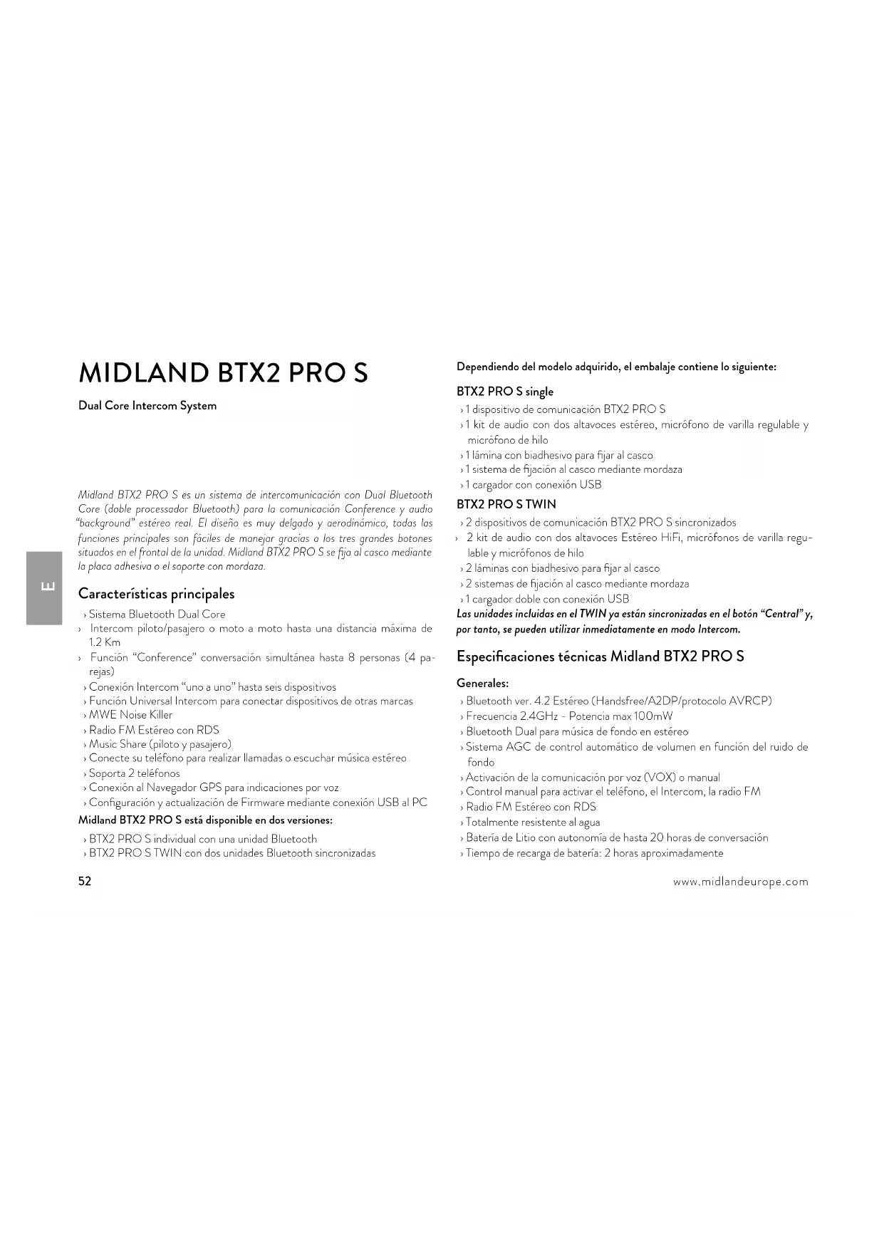 › Función “Conference” conversación simultánea hasta 8 personas (4 pa- rejas) › Conexión Intercom “uno a uno” hasta seis dispositivos › Función Universal Intercom para conectar dispositivos de otras marcas › MWE Noise Killer › Radio FM Estéreo con RDS › Music Share (piloto y pasajero) › Conecte su teléfono para realizar llamadas o escuchar música estéreo › Soporta 2 teléfonos › Conexión al Navegador GPS para indicaciones por voz › Configuración y actualización de Firmware mediante conexión USB al PC Midland BTX2 PRO S está disponible en dos versiones: › BTX2 PRO S individual con una unidad Bluetooth › BTX2 PRO S TWIN con dos unidades Bluetooth sincronizadas Dependiendo del modelo adquirido, el embalaje contiene lo siguiente: BTX2 PRO S single › 1 dispositivo de comunicación BTX2 PRO S › 1 kit de audio con dos altavoces estéreo, micrófono de varilla regulable y micrófono de hilo › 1 lámina con biadhesivo para fijar al casco › 1 sistema de fijación al casco mediante mordaza › 1 cargador con conexión USB