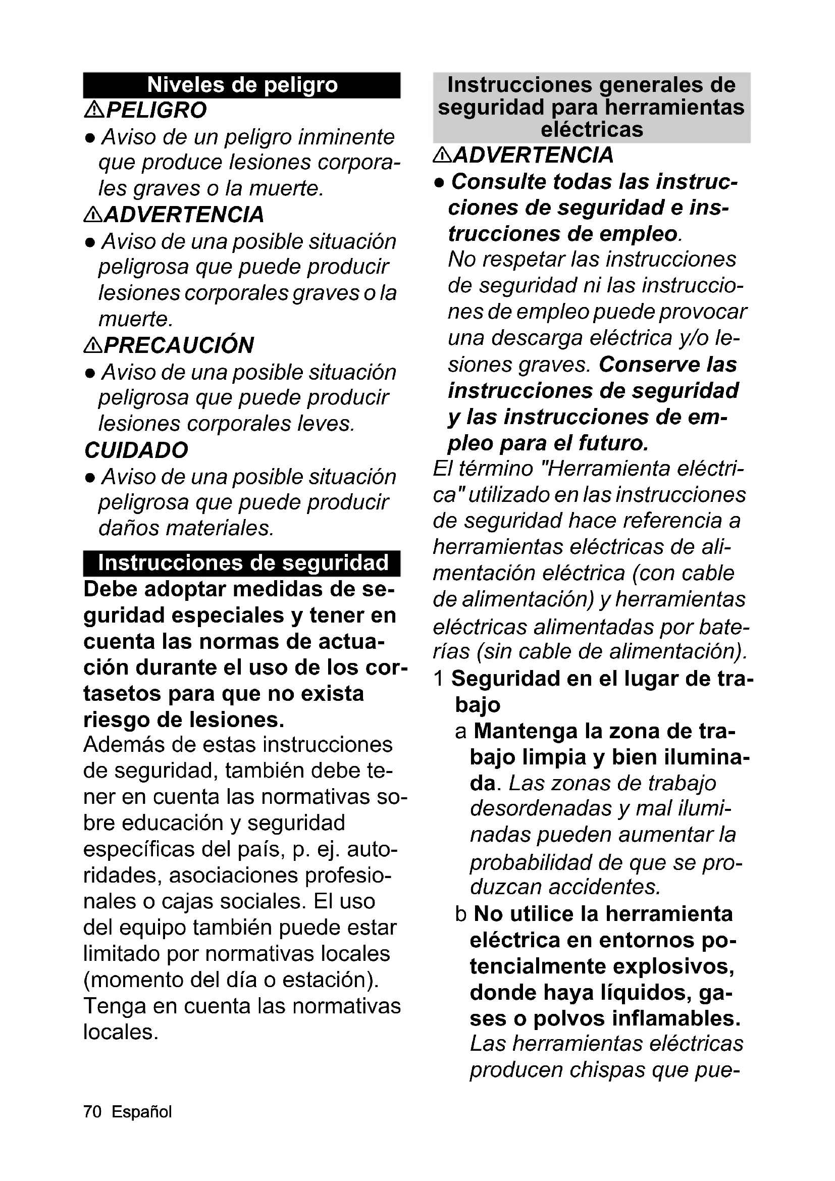 - Declaración de conformidad UE Español Niveles de peligro PELIGRO ● Aviso de un peligro inminente que produce lesiones corpora- les graves o la muerte. 몇 ADVERTENCIA ● Aviso de una posible situación peligrosa que puede producir lesiones corporales graves o la muerte. 몇 PRECAUCIÓN ● Aviso de una posible situación peligrosa que puede producir lesiones corporales leves. CUIDADO ● Aviso de una posible situación peligrosa que puede producir daños materiales. Instrucciones de seguridad Debe adoptar medidas de se- guridad especiales y tener en cuenta las normas de actua- ción durante el uso de los cor- tasetos para que no exista riesgo de lesiones. Además de estas instrucciones de seguridad, también debe te- ner en cuenta las normativas so- bre educación y seguridad específicas del país, p. ej. auto- ridades, asociaciones profesio- nales o cajas sociales. El uso del equipo también puede estar limitado por normativas locales (momento del día o estación). Tenga en cuenta las normativas locales. Instrucciones generales de seguridad para herramientas eléctricas 몇 ADVERTENCIA ● Consulte todas las instruc- ciones de seguridad e ins- trucciones de empleo. No respetar las instrucciones de seguridad ni las instruccio- nes de empleo puede provocar una descarga eléctrica y/o le- siones graves. Conserve las instrucciones de seguridad y las instrucciones de em- pleo para el futuro. El término "Herramienta eléctri- ca" utilizado en las instrucciones de seguridad hace referencia a herramientas eléctricas de ali- mentación eléctrica (con cable de alimentación) y herramientas eléctricas alimentadas por bate- rías (sin cable de alimentación). 1 Seguridad en el lugar de tra- bajo a Mantenga la zona de tra- bajo limpia y bien ilumina- da. Las zonas de trabajo desordenadas y mal ilumi- nadas pueden aumentar la probabilidad de que se pro- duzcan accidentes. b No utilice la herramienta eléctrica en entornos po- tencialmente explosivos, donde haya líquidos, ga- ses o polvos inflamables. Las herramientas eléctricas producen chispas que pue-Español 71 den provocar la combustión del polvo o los gases. c Mantenga a los niños y a otras personas alejadas durante el uso de la herra- mienta eléctrica. Si se dis- trae, puede perder el control del equipo. 2 Seguridad eléctrica a El elemento de conexión de la herramienta eléctrica debe encajar en el enchu- fe. No se permite modifi- car el conector de ninguna manera. No utilice un co- nector de adaptación con herramientas eléctricas con puesta a tierra. Un co- nector sin alterar y un en- chufe adecuado reducen el riesgo de descarga eléctri- ca. b Evite el contacto corporal con las superficies conec- tadas a tierra, como tubos, calefacción, hornillos o fri- goríficos. Existe un mayor riesgo de descarga eléctrica si el cuerpo está conectado a tierra. c Mantenga las herramien- tas eléctricas alejadas de la lluvia o la humedad. La penetración de agua en una herramienta eléctrica au- menta el riesgo de descarga eléctrica. d No utilice el cable de for- ma inadecuada para portar la herramienta eléctrica, colgarla o desenchufar el conector. Mantenga el ca- ble alejado de calor, acei- te, cantos afilados o componentes del equipo en movimiento. Los cables de conexión dañados o en- rollados aumentan el riesgo de descarga eléctrica. e Si utiliza una herramienta eléctrica al aire libre, solo puede emplear cables de prolongación adecuados para su uso en exteriores. El uso de un cable de pro- longación adecuado para exteriores reduce el riesgo de descarga eléctrica. f Si no se puede evitar el funcionamiento de la he- rramienta eléctrica en un entorno húmedo, utilice un interruptor de corriente de defecto. El uso de un in- terruptor de corriente de de- fecto reduce el riesgo de descarga eléctrica. 3 Seguridad de personas a Preste atención a lo que haga y proceda con senti- do común a la hora de tra- bajar con una herramienta eléctrica. No utilice herra- mientas eléctricas si está cansado o si se encuentra bajo la influencia de dro- gas, alcohol o medica- mentos. Un momento de72 Español descuido a la hora de utilizar la herramienta eléctrica pue- de provocar heridas graves. b Lleve siempre su equipo de protección personal y unas gafas de protección. Llevar puesto el equipo de protección personal (como máscara antipolvo, zapatos de seguridad antideslizan- tes, casco de protección o protección para oídos), en función del tipo y del uso de la herramienta eléctrica, re- duce el riesgo de lesiones. c Evite una puesta en fun- cionamiento involuntaria. Asegúrese de que la he- rramienta eléctrica esté apagada antes de portar, colocar o usar la alimenta- ción de corriente y/o la ba- tería. Pueden producirse accidentes si, al portar la he- rramienta eléctrica, tiene un dedo en el interruptor o co- necta el equipo encendido a la alimentación de corriente. d Retire la herramienta de ajuste o la llave ajustable antes de conectar la herra- mienta eléctrica. Una he- rramienta o llave que se encuentre en un componen- te giratorio puede producir lesiones. e Evite una postura corporal poco natural. Permanezca siempre en una postura segura y mantenga siem- pre el equilibrio. De esa forma, puede controlar me- jor la herramienta eléctrica en situaciones inesperadas. f Lleve ropa adecuada. No use joyas ni ropa holgada. Mantenga el cabello, la ro- pa y los guantes alejados de los componentes móvi- les. Los componentes móvi- les pueden atrapar la ropa holgada, los guantes, las jo- yas o el cabello largo. g Si se pueden montar dis- positivos de aspiración y almacenamiento de polvo, asegúrese de que están conectados y se utilizan de forma adecuada. El uso de un dispositivo de aspira- ción de polvo puede reducir los riesgos provocados por la presencia de polvo. 4 Uso y manipulación de la herramienta eléctrica a No sobrecargue el equipo. Utilice la herramienta eléc- trica adecuada para su tra- bajo. La herramienta e