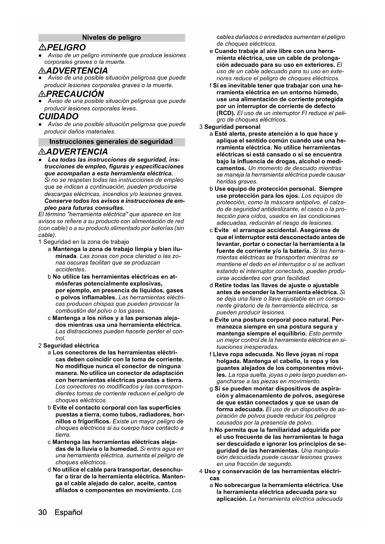 roducir daños materiales. Instrucciones generales de seguridad 몇 ADVERTENCIA ● Lea todas las instrucciones de seguridad, ins- trucciones de empleo, figuras y especificaciones que acompañan a esta herramienta eléctrica. Si no se respetan todas las instrucciones de empleo que se indican a continuación, pueden producirse descargas eléctricas, incendios y/o lesiones graves. Conserve todos los avisos e instrucciones de em- pleo para futuras consultas. El término "herramienta eléctrica" que aparece en los avisos se refiere a su producto con alimentación de red (con cable) o a su producto alimentado por baterías (sin cable). 1 Seguridad en la zona de trabajo a Mantenga la zona de trabajo limpia y bien ilu- minada. Las zonas con poca claridad o las zo- nas oscuras facilitan que se produzcan accidentes. b No utilice las herramientas eléctricas en at- mósferas potencialmente explosivas, por ejemplo, en presencia de líquidos, gases o polvos inflamables. Las herramientas eléctri- cas producen chispas que pueden provocar