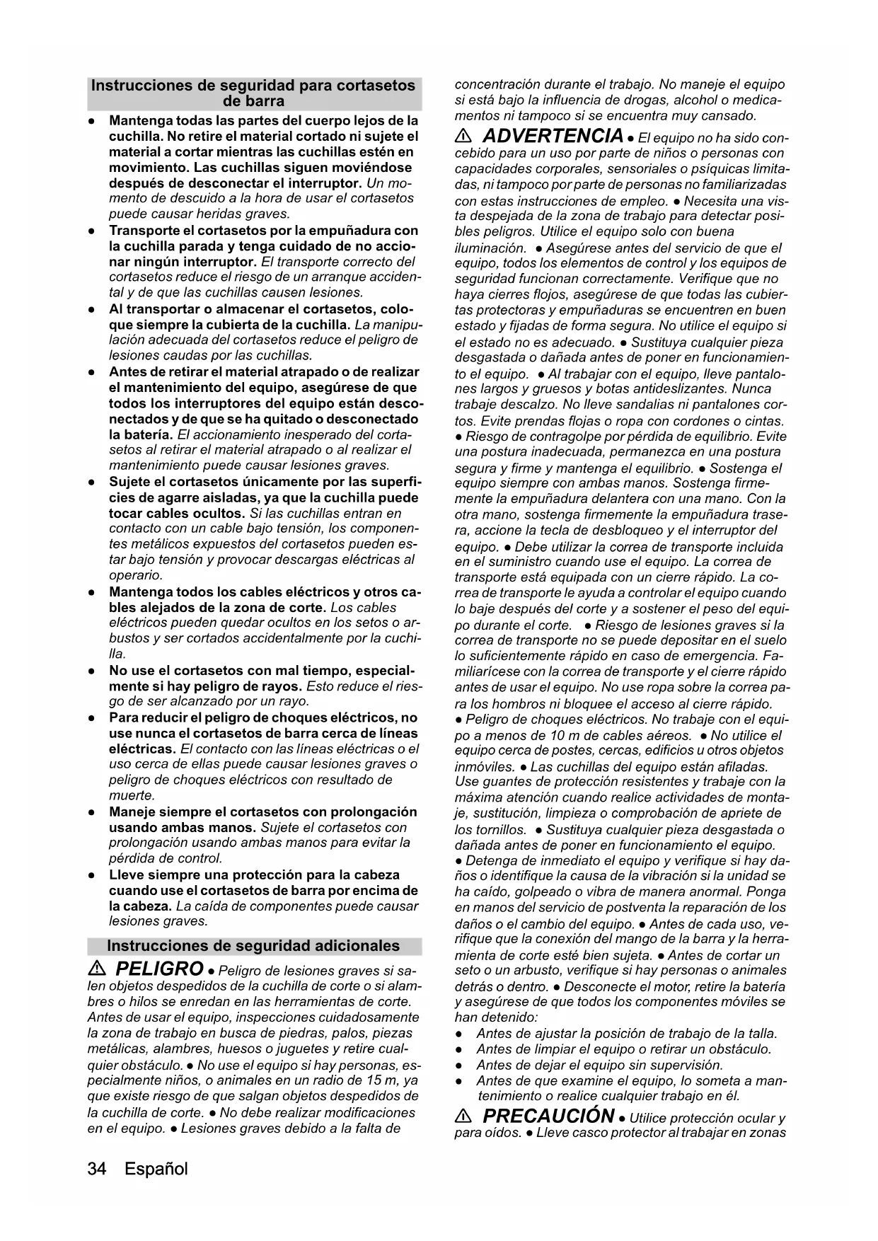 - Declaración de conformidad UE Español Instrucciones de seguridad para cortasetos de barra ● Mantenga todas las partes del cuerpo lejos de la cuchilla. No retire el material cortado ni sujete el material a cortar mientras las cuchillas estén en movimiento. Las cuchillas siguen moviéndose después de desconectar el interruptor. Un mo- mento de descuido a la hora de usar el cortasetos puede causar heridas graves. ● Transporte el cortasetos por la empuñadura con la cuchilla parada y tenga cuidado de no accio- nar ningún interruptor. El transporte correcto del cortasetos reduce el riesgo de un arranque acciden- tal y de que las cuchillas causen lesiones. ● Al transportar o almacenar el cortasetos, colo- que siempre la cubierta de la cuchilla. La manipu- lación adecuada del cortasetos reduce el peligro de lesiones caudas por las cuchillas. ● Antes de retirar el material atrapado o de realizar el mantenimiento del equipo, asegúrese de que todos los interruptores del equipo están desco- nectados y de que se ha quitado o desconectado la batería. El accionamiento inesperado del corta- setos al retirar el material atrapado o al realizar el mantenimiento puede causar lesiones graves. ● Sujete el cortasetos únicamente por las superfi- cies de agarre aisladas, ya que la cuchilla puede tocar cables ocultos. Si las cuchillas entran en contacto con un cable bajo tensión, los componen- tes metálicos expuestos del cortasetos pueden es- tar bajo tensión y provocar descargas eléctricas al operario. ● Mantenga todos los cables eléctricos y otros ca- bles alejados de la zona de corte. Los cables eléctricos pueden quedar ocultos en los setos o ar- bustos y ser cortados accidentalmente por la cuchi- lla. ● No use el cortasetos con mal tiempo, especial- mente si hay peligro de rayos. Esto reduce el ries- go de ser alcanzado por un rayo. ● Para reducir el peligro de choques eléctricos, no use nunca el cortasetos de barra cerca de líneas eléctricas. El contacto con las líneas eléctricas o el uso cerca de ellas puede causar lesiones graves o peligro de choques eléctricos con resultado de muerte. ● Maneje siempre el cortasetos con prolongación usando ambas manos. Sujete el cortasetos con prolongación usando ambas manos para evitar la pérdida de control. ● Lleve siempre una protección para la cabeza cuando use el cortasetos de barra por encima de la cabeza. La caída de componentes puede causar lesiones graves. Instrucciones de seguridad adicionales PELIGRO ● Peligro de lesiones graves si sa- len objetos despedidos de la cuchilla de corte o si alam- bres o hilos se enredan en las herramientas de corte. Antes de usar el equipo, inspecciones cuidadosamente la zona de trabajo en busca de piedras, palos, piezas metálicas, alambres, huesos o juguetes y retire cual- quier obstáculo. ● No use el equipo si hay personas, es- pecialmente niños, o animales en un radio de 15 m, ya que existe riesgo de que salgan objetos despedidos de la cuchilla de corte. ● No debe realizar modificaciones en el equipo. ● Lesiones graves debido a la falta de concentración durante el trabajo. No maneje el equipo si está bajo la influencia de drogas, alcohol o medica- mentos ni tampoco si se encuentra muy cansado. 몇 ADVERTENCIA ● El equipo no ha sido con- cebido para un uso por parte de niños o personas con capacidades corporales, sensoriales o psíquicas limita- das, ni tampoco por parte de personas no familiarizadas con estas instrucciones de empleo. ● Necesita una vis- ta despejada de la zona de trabajo para detectar posi- bles peligros. Utilice el equipo solo con buena iluminación. ● Asegúrese antes del servicio de que el equipo, todos los elementos de control y los equipos de seguridad funcionan correctamente. Verifique que no haya cierres flojos, asegúrese de que todas las cubier- tas protectoras y empuñaduras se encuentren en buen estado y fijadas de forma segura. No utilice el equipo si el estado no es adecuado. ● Sustituya cualquier pieza desgastada o dañada antes de poner en funcionamien- to el equipo. ● Al trabajar con el equipo, lleve pantalo- nes largos y gruesos y botas antideslizantes. Nunca trabaje descalzo. No lleve sandalias ni pantalones cor- tos. Evite prendas flojas o ropa con cordones o cintas. ● Riesgo de contragolpe por pérdida de equilibrio. Evite una postura inadecuada, permanezca en una postura segura y firme y mantenga el equilibrio. ● Sostenga el equipo siempre con ambas manos. Sostenga firme- mente la empuñadura delantera con una mano. Con la otra mano, sostenga firmemente la empuñadura trase- ra, accione la tecla de desbloqueo y el interruptor del equipo. ● Debe utilizar la correa de transporte incluida en el suministro cuando use el equipo. La correa de transporte está equipada con un cierre rápido. La co- rrea de transporte le ayuda a controlar el equipo cuando lo baje después del corte y a sostener el peso del equi- po durante el corte. ● Riesgo de lesiones graves si la correa de transporte no se puede depositar en el suelo lo suficientemente rápido en caso de emergencia. Fa- miliarícese con la correa de transporte y el cierre rápido antes de usar el equipo. No use ropa sobre la correa pa- ra los hombros ni bloquee el acceso al cierre rápido. ● Peligro de choques eléctricos. No trabaje con el equi- po a menos de 10 m de cables aéreos. ● No utilice el equipo cerca de postes, cercas, edificios u otros objetos inmóviles. ● Las cuchillas del equipo están afiladas. Use guantes de protección resistentes y trabaje con la máxima atención cuando realice actividades de monta- je, sustitución, limpieza o comprobación de apriete de los tornillos. ● Sustituya cualquier pieza desgastada o dañada antes de poner en funcionamiento el equipo. ● Detenga de inmediato el equipo y verifique si hay da- ños o identifique la causa de la vibración si la unidad se ha caído, golpeado o vibra de manera anormal. Ponga en manos
