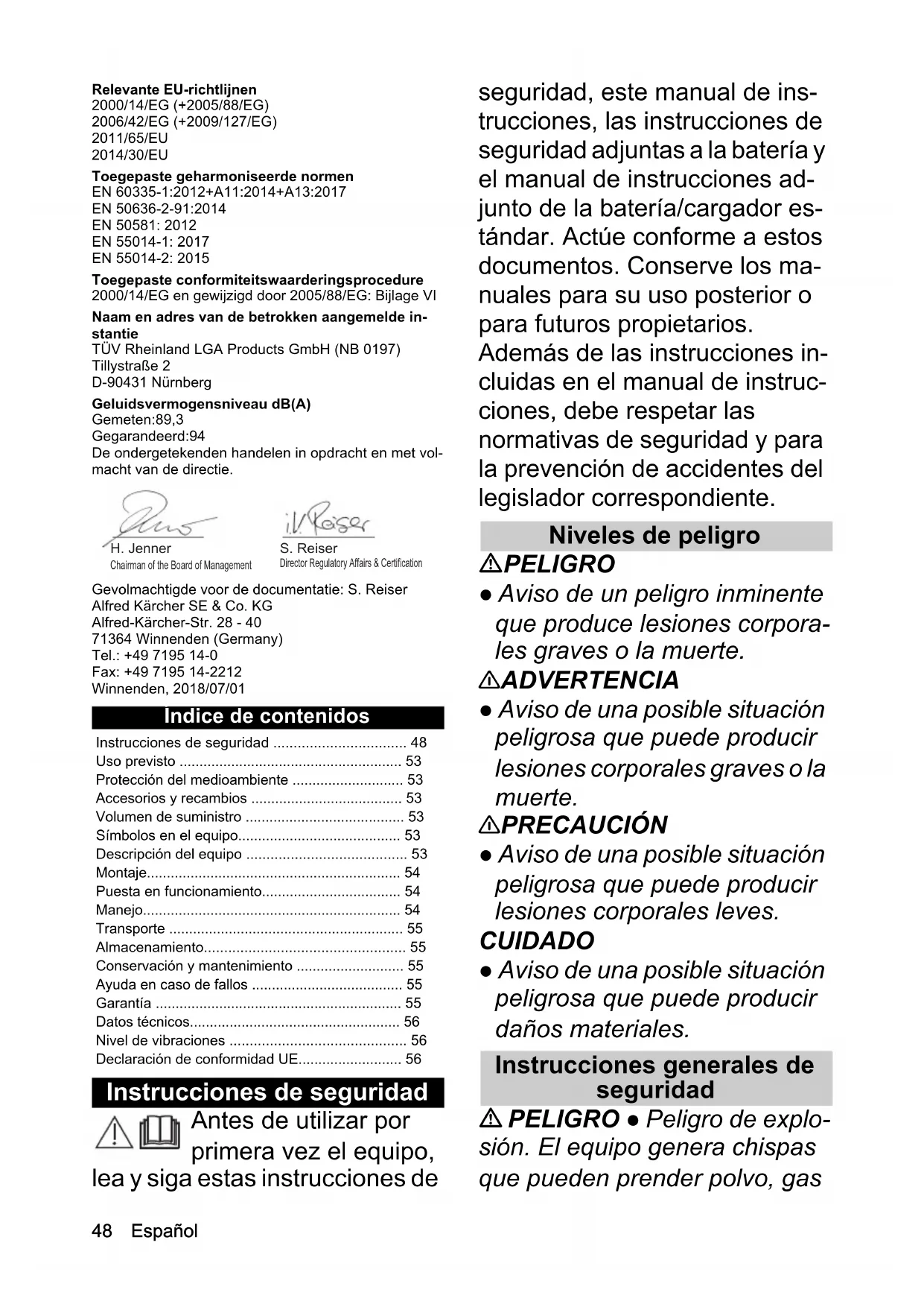 - 2,1 Onzekerheid K dB(A) 1,5 Afmetingen en gewichten Lengte x breedte x hoogte mm 1773 x 366 x 277 Gewicht (zonder accupack) kg 4,048 Español Relevante EU-richtlijnen 2000/14/EG (+2005/88/EG) 2006/42/EG (+2009/127/EG) 2011/65/EU 2014/30/EU Toegepaste geharmoniseerde normen EN 60335-1:2012+A11:2014+A13:2017 EN 50636-2-91:2014 EN 50581: 2012 EN 55014-1: 2017 EN 55014-2: 2015 Toegepaste conformiteitswaarderingsprocedure 2000/14/EG en gewijzigd door 2005/88/EG: Bijlage VI Naam en adres van de betrokken aangemelde in- stantie TÜV Rheinland LGA Products GmbH (NB 0197) Tillystraße 2 D-90431 Nürnberg Geluidsvermogensniveau dB(A) Gemeten:89,3 Gegarandeerd:94 De ondergetekenden handelen in opdracht en met vol- macht van de directie. Gevolmachtigde voor de documentatie: S. Reiser Alfred Kärcher SE & Co. KG Alfred-Kärcher-Str. 28 - 40 71364 Winnenden (Germany) Tel.: +49 7195 14-0 Fax: +49 7195 14-2212 Winnenden, 2018/07/01 Índice de contenidos Instrucciones de seguridad Antes de utilizar por primera vez el equipo, lea y siga estas instrucciones de seguridad, este manual de ins- trucciones, las instrucciones de seguridad adjuntas a la batería y el manual de instrucciones ad- junto de la batería/cargador es- tándar. Actúe conforme a estos documentos. Conserve los ma- nuales para su uso posterior o para futuros propietarios. Además de las instrucciones in- cluidas en el manual de instruc- ciones, debe respetar las normativas de seguridad y para la prevención de accidentes del legislador correspondiente. Niveles de peligro PELIGRO ● Aviso de un peligro inminente que produce lesiones corpora- les graves o la muerte. 몇 ADVERTENCIA ● Aviso de una posible situación peligrosa que puede producir lesiones corporales graves o la muerte. 몇 PRECAUCIÓN ● Aviso de una posible situación peligrosa que puede producir lesiones corporales leves. CUIDADO ● Aviso de una posible situación peligrosa que puede producir daños materiales. Instrucciones generales de seguridad PELIGRO ● Peligro de explo- sión. El equipo genera chispas que pueden prender polvo, gas Instrucciones de seguridad p. 48