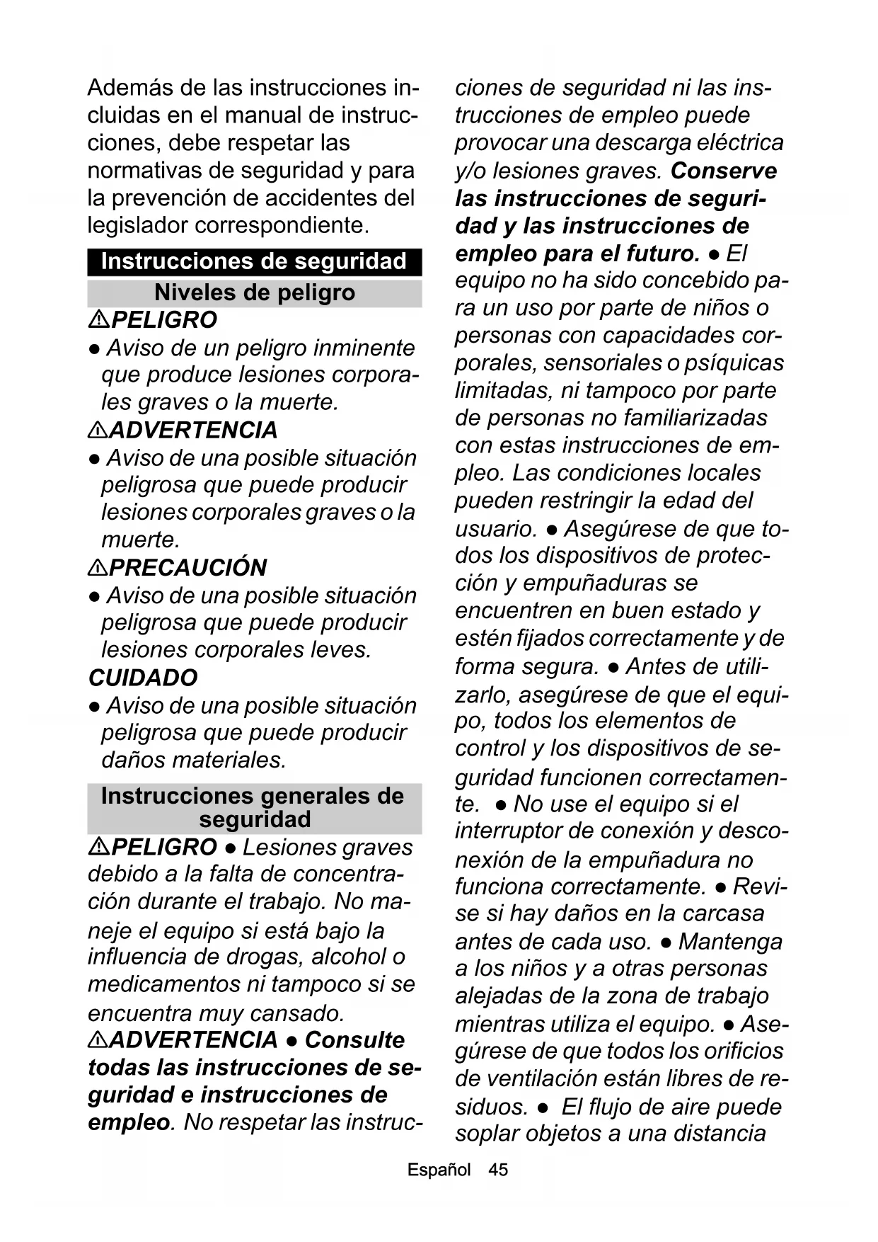 - Declaración de conformidad UE Chairman of the Board of ManagementDirector Regulatory Affairs & CertificationH. JennerS. ReiserEspañol 45 Además de las instrucciones in- cluidas en el manual de instruc- ciones, debe respetar las normativas de seguridad y para la prevención de accidentes del legislador correspondiente. Instrucciones de seguridad Niveles de peligro PELIGRO ● Aviso de un peligro inminente que produce lesiones corpora- les graves o la muerte. 몇 ADVERTENCIA ● Aviso de una posible situación peligrosa que puede producir lesiones corporales graves o la muerte. 몇 PRECAUCIÓN ● Aviso de una posible situación peligrosa que puede producir lesiones corporales leves. CUIDADO ● Aviso de una posible situación peligrosa que puede producir daños materiales. Instrucciones generales de seguridad PELIGRO ● Lesiones graves debido a la falta de concentra- ción durante el trabajo. No ma- neje el equipo si está bajo la influencia de drogas, alcohol o medicamentos ni tampoco si se encuentra muy cansado. 몇 ADVERTENCIA ● Consulte todas las instrucciones de se- guridad e instrucciones de empleo. No respetar las instruc- ciones de seguridad ni las ins- trucciones de empleo puede provocar una descarga eléctrica y/o lesiones graves. Conserve las instrucciones de seguri- dad y las instrucciones de empleo para el futuro. ● El equipo no ha sido concebido pa- ra un uso por parte de niños o personas con capacidades cor- porales, sensoriales o psíquicas limitadas, ni tampoco por parte de personas no familiarizadas con estas instrucciones de em- pleo. Las condiciones locales pueden restringir la edad del usuario. ● Asegúrese de que to- dos los dispositivos de protec- ción y empuñaduras se encuentren en buen estado y estén fijados correctamente y de forma segura. ● Antes de utili- zarlo, asegúrese de que el equi- po, todos los elementos de control y los dispositivos de se- guridad funcionen correctamen- te. ● No use el equipo si el interruptor de conexión y desco- nexión de la empuñadura no funciona correctamente. ● Revi- se si hay daños en la carcasa antes de cada uso. ● Mantenga a los niños y a otras personas alejadas de la zona de trabajo mientras utiliza el equipo. ● Ase- gúrese de que todos los orificios de ventilación están libres de re- siduos. ● El flujo de aire puede soplar objetos a una distancia46 Español considerable. Antes de usar el equipo, inspeccione cuidadosa- mente la zona de trabajo en busca de objetos como piedras, vidrios rotos, clavos, alambre o hilos y retírelos. ● Opere el equi- po solo en una superficie firme y nivelada y en la posición reco- mendada. 몇 PRECAUCIÓN ● Familiaríce- se con los elementos de control y el uso correcto del equipo. ● Use protección auditiva com- pleta cuando use el equipo. El equipo es ruidoso y puede cau- sar daños auditivos permanen- tes si no sigue estrictamente las instrucciones sobre exposición, reducción de ruido y protección para oídos. ● Use protección ocular completa cuando use el equipo. El fabricante recomien- da encarecidamente usar una máscara facial completa o gafas de protección completamente cerradas. Las gafas o gafas de sol normales no protegerán de los objetos arrojados. ● Al traba- jar con el equipo, lleve pantalo- nes largos y gruesos, calzado resistente y guantes bien colo- cados. Nunca trabaje descalzo. No lleve joyas, sandalias ni pan- talones cortos. CUIDADO ● El usuario del equi- po será el responsable de posi- bles accidentes que involucren a otras personas o sus posesio- nes. Nota ● En algunas regiones, las normativas pueden restringir el uso de este equipo. Pida conse- jo a la autoridad local. ● Encar- gue al servicio de posventa autorizado que sustituya los ró- tulos de advertencia del equipo dañados o ilegibles. Funcionamiento seguro PELIGRO ● Queda prohibido su uso en entornos explosivos. 몇 ADVERTENCIA ● Mantenga una distancia mínima de 15 m con respecto a personas o ani- males. Detenga el equipo si al- guien entra en dicha zona. ● No utilice el equipo en caso de ries- go de relámpagos. ● Necesita una vista despejada de la zona de trabajo para detectar posi- bles peligros. Utilice el equipo solo con buena iluminación. ● No acelere el paso, sino cami- ne despacio al trabajar con el equipo. No camine hacia atrás. Evite una postura inadecuada, permanezca en una postura se- gura y firme y mantenga el equi- librio. ● Detenga de inmediato el equipo y verifique si hay daños o identifique la causa de la vibra- ción si la unidad se ha caído, golpeado o vibra de manera anormal. Ponga en manos del servicio de postventa la repara- ción de los daños o el cambio del equipo. ● Apague el equipo y extraiga la batería en caso deEspañol 47 avería o accidente. Puede vol- ver a poner en funcionamiento el equipo si un servicio de pos- venta autorizado lo comprueba. ● La manguera de soplado con tubo de mochila dispone de un arnés. Ajuste el arnés con cui- dado para distribuir el peso del equipo. Familiarícese con el ar- nés y el cierre rápido antes de usar el equipo. En caso de peli- gro, el uso correcto puede prote- gerlo de lesiones graves. No use ropa sobre el arnés ni impi- da en ningún caso el acceso al cierre rápido. ● Riesgo de lesio- nes en piezas giratorias. Desco- necte el motor, retire la batería y asegúrese de que todos los componentes móviles se han detenido: Antes de dejar el equipo sin supervisión. Antes de comprobar el equipo después de que haya sido golpeado por un objeto extra- ño. Antes de que examinar el equipo, realizar trabajos de mantenimiento en él o trabajar con él. 몇 PRECAUCIÓN ● El servicio de herramientas similares en el medio ambiente aumenta el riesgo de daño auditivo y la pro- babilidad de pasar por alto ries- gos potenciales, p. ej., personas que entran en su zona de traba- jo. ● No realice ningún cambio en el dispositivo y solo use ac- cesorios y repuestos recomen- dad