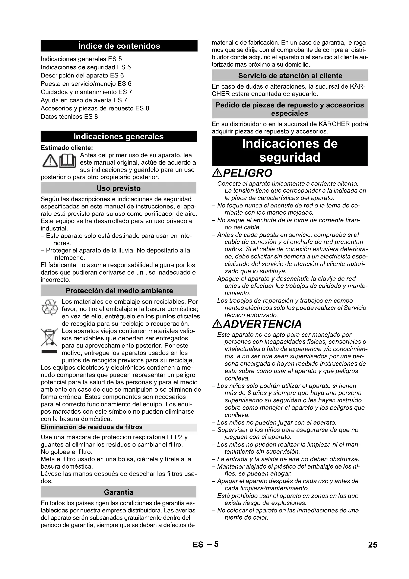 dB(A) dB(A) dB(A) 24 NL– 5 Estimado cliente: Antes del primer uso de su aparato, lea este manual original, actúe de acuerdo a sus indicaciones y guárdelo para un uso posterior o para otro propietario posterior. Según las descripciones e indicaciones de seguridad especificadas en este manual de instrucciones, el apa- rato está previsto para su uso como purificador de aire. Este equipo se ha desarrollado para su uso privado e industrial. – Este aparato solo está destinado para usar en inte- riores. – Proteger el aparato de la lluvia. No depositarlo a la intemperie. El fabricante no asume responsabilidad alguna por los daños que pudieran derivarse de un uso inadecuado o incorrecto. Los materiales de embalaje son reciclables. Por favor, no tire el embalaje a la basura doméstica; en vez de ello, entréguelo en los puntos oficiales de recogida para su reciclaje o recuperación. Los aparatos viejos contienen materiales valio- sos reciclables que deberían ser entregados para su aprovechamiento posterior. Por este motivo, entregue los aparatos usados en los puntos de recogida previstos para su reciclaje. Los equipos eléctricos y electrónicos contienen a me- nudo componentes que pueden representar un peligro potencial para la salud de las personas y para el medio ambiente en caso de que se manipulen o se eliminen de forma errónea. Estos componentes son necesarios para el correcto funcionamiento del equipo. Los equi- pos marcados con este símbolo no pueden eliminarse con la basura doméstica. Use una máscara de protección respiratoria FFP2 y guantes al eliminar los residuos o cambiar el filtro. No golpee el filtro. Meta el filtro usado en una bolsa, ciérrela y tírela a la basura doméstica. Lávese las manos después de desechar los filtros usa- dos. En todos los países rigen las condiciones de garantía es- tablecidas por nuestra empresa distribuidora. Las averías del aparato serán subsanadas gratuitamente dentro del periodo de garantía, siempre que se deban a defectos de material o de fabricación. En un caso de garantía, le roga- mos que se dirija con el comprobante de compra al distri- buidor donde adquirió el aparato o al servicio al cliente au- torizado más próximo a su domicilio. En caso de dudas o alteraciones, la sucursal de KÄR- CHER estará encantada de ayudarle. En su distribuidor o en la sucursal de KÄRCHER podrá adquirir piezas de repuesto y accesorios. PELIGRO – Conecte el aparato únicamente a corriente alterna. La tensión tiene que corresponder a la indicada en la placa de características del aparato. – No toque nunca el enchufe de red o la toma de co- rriente con las manos mojadas. – No saque el enchufe de la toma de corriente tiran- do del cable. – Antes de cada puesta en servicio, compruebe si el cable de conexión y el enchufe de red presentan daños. Si el cable de conexión estuviera deteriora- do, debe solicitar sin demora a un electricista espe- cializado del servicio de atención al cliente autori- zado que lo sustituya. – Apague el aparato y desenchufe la clavija de red antes de efectuar los trabajos de cuidado y mante- nimiento. – Los trabajos de reparación y trabajos en compo- nentes eléctricos sólo los puede realizar el Servicio técnico autorizado. ADVERTENCIA – Este aparato no es apto para ser manejado por personas con incapacidades físicas, sensoriales o intelectuales o falta de experiencia y/o conocimien- tos, a no ser que sean supervisados por una per- sona encargada o hayan recibido instrucciones de esta sobre como usar el aparato y qué peligros conlleva. – Los niños solo podrán utilizar el aparato si tienen más de 8 años y siempre que haya una persona supervisando su seguridad o les hayan instruido sobre como manejar el aparato y los peligros que conlleva. – Los niños no pueden jugar con el aparato. – Supervisar a los niños para asegurarse de que no jueguen con el aparato. – Los niños no pueden realizar la limpieza ni el man- tenimiento sin supervisión. – La entrada y la salida de aire no deben obstruirse. – Mantener alejado el plástico del embalaje de los ni- ños, se pueden ahogar. – Apagar el aparato después de cada uso y antes de cada limpieza/mantenimiento. – Está prohibido usar el aparato en zonas en las que exista riesgo de explosiones. – No colocar el aparato en las inmediaciones de una fuente de calor. Índice de contenidos Indicaciones generales ES 5 Indicaciones de seguridad ES 5 Descripción del aparato ES 6 Puesta en servicio/manejo ES 6 Cuidados y mantenimiento ES 7 Ayuda en caso de avería ES 7 Accesorios y piezas de repuesto ES 8 Datos técnicos ES 8 Indicaciones generales Uso previsto Protección del medio ambiente Eliminación de residuos de filtros Garantía Servicio de atención al cliente Pedido de piezas de repuesto y accesorios especiales Indicaciones de seguridad 25ES– 6 PRECAUCIÓN – El aparato no sustituye una ventilación adecuada. – Apoyar bien el aparato sobre una base llana y co- locarlo. – Emplee únicamente repuestos originales de KÄR- CHER. – No utilice el aparato en entornos húmedos o en ha- bitaciones con una elevada temperatura ambiente, p. ej. en el baño o la cocina. PELIGRO Aviso sobre un riesgo de peligro inmediato que puede provocar lesiones corporales graves o la muerte. 몇 ADVERTENCIA Aviso sobre una situación propablemente peligrosa que puede provocar lesiones corporales graves o la muerte. 몇 PRECAUCIÓN Indicación sobre una situación que puede ser peligrosa, que puede acarrear lesiones leves. CUIDADO Aviso sobre una situación probablemente peligrosa que puede provocar daños materiales. Cuando desempaque el contenido del paquete, com- pruebe si faltan accesorios o si el aparato presenta da- ños. Informe a su distribuidor en caso de detectar daños ocasionados durante el transporte. Ilustraciones, véase la contraportada. 1 Cubierta del filtro delantera 2 filtro previo 3 Filtro principal 4 Cubierta del filtro trasera 