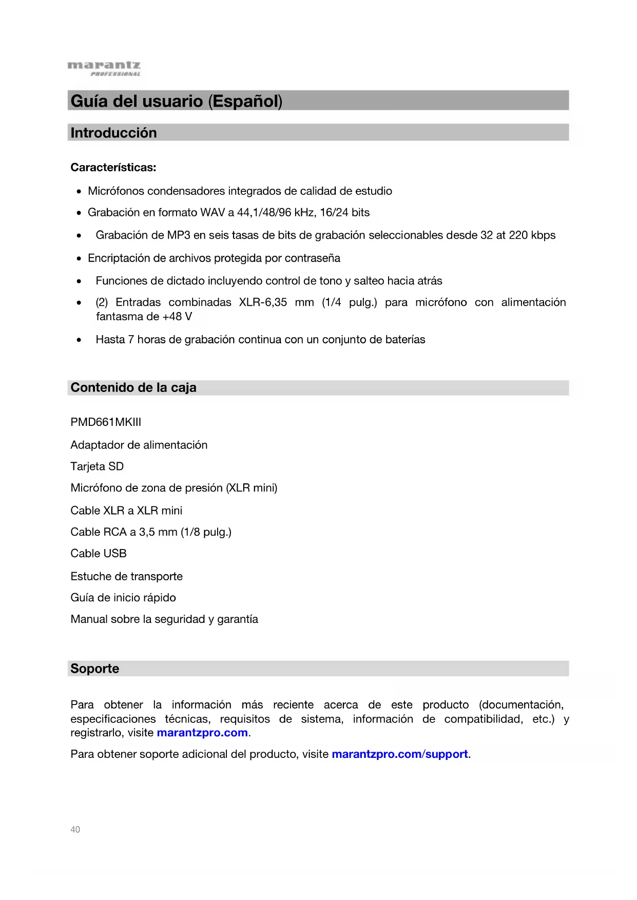 Contenido de la caja PMD661MKIII Adaptador de alimentación Tarjeta SD Micrófono de zona de presión (XLR mini) Cable XLR a XLR mini Cable RCA a 3,5 mm (1/8 pulg.) Cable USB Estuche de transporte Guía de inicio rápido Manual sobre la seguridad y garantía