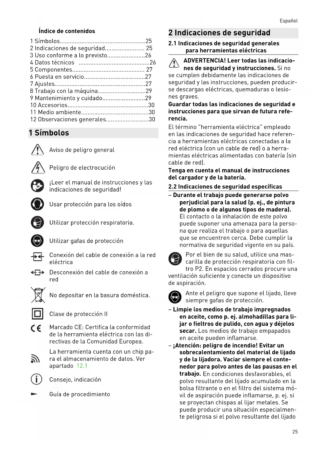 - 12 Observaciones generales 1 Símbolos Aviso de peligro general Peligro de electrocución ¡Leer el manual de instrucciones y las indicaciones de seguridad! Usar protección para los oídos Utilizar protección respiratoria. Utilizar gafas de protección Conexión del cable de conexión a la red eléctrica Desconexión del cable de conexión a red No depositar en la basura doméstica. Clase de protección II Marcado CE: Certifica la conformidad de la herramienta eléctrica con las di rectivas de la Comunidad Europea. La herramienta cuenta con un chip pa ra el almacenamiento de datos. Ver apartado 12.1 Consejo, indicación Guía de procedimiento 2 Indicaciones de seguridad p. 30