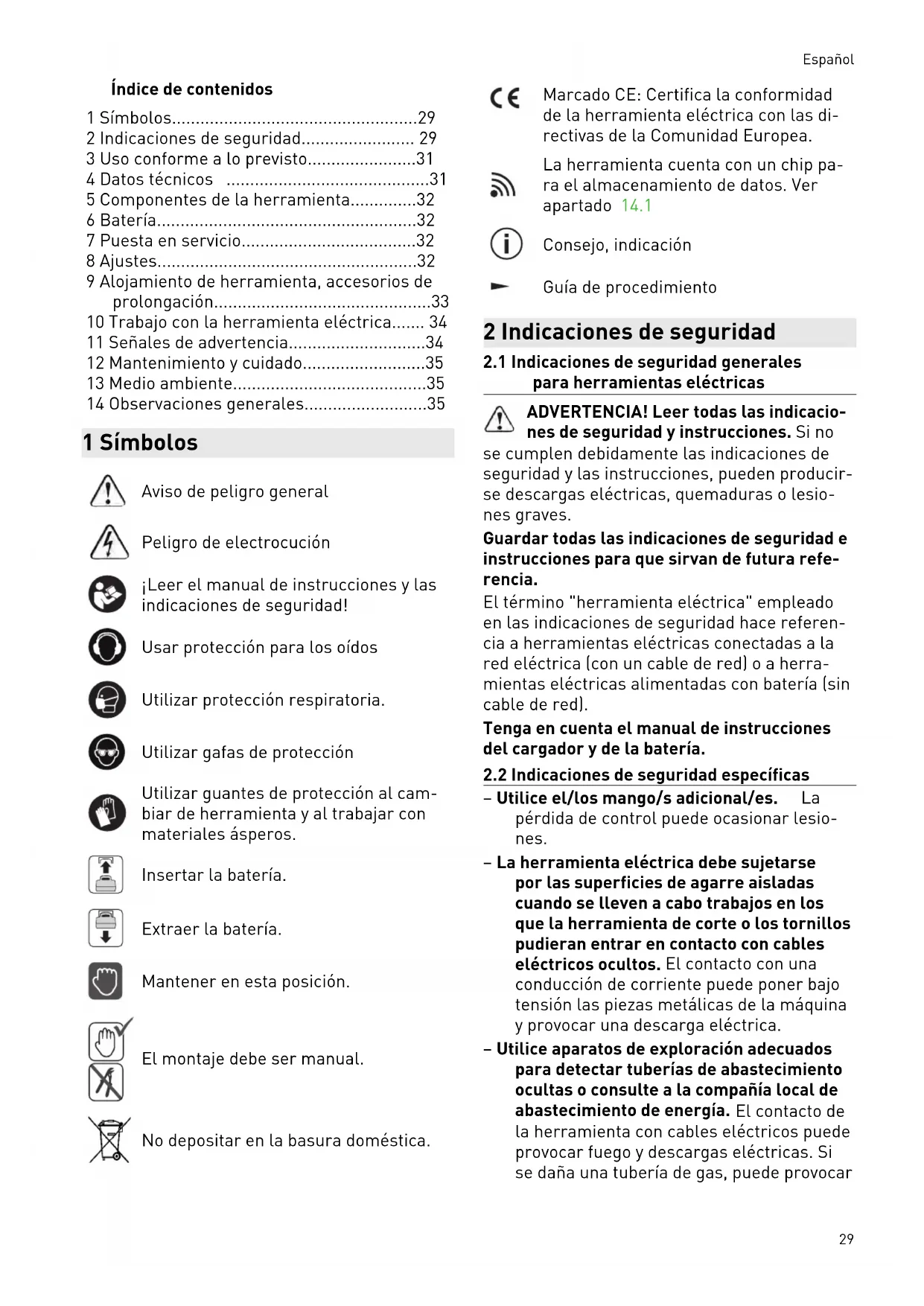 - 14 Observaciones generales 1 Símbolos Aviso de peligro general Peligro de electrocución ¡Leer el manual de instrucciones y las indicaciones de seguridad! Usar protección para los oídos Utilizar protección respiratoria. Utilizar gafas de protección Utilizar guantes de protección al cam biar de herramienta y al trabajar con materiales ásperos. Insertar la batería. Extraer la batería. Mantener en esta posición. El montaje debe ser manual. No depositar en la basura doméstica. Marcado CE: Certifica la conformidad de la herramienta eléctrica con las di rectivas de la Comunidad Europea. La herramienta cuenta con un chip pa ra el almacenamiento de datos. Ver apartado 14.1 Consejo, indicación Guía de procedimiento 2 Indicaciones de seguridad p. 35