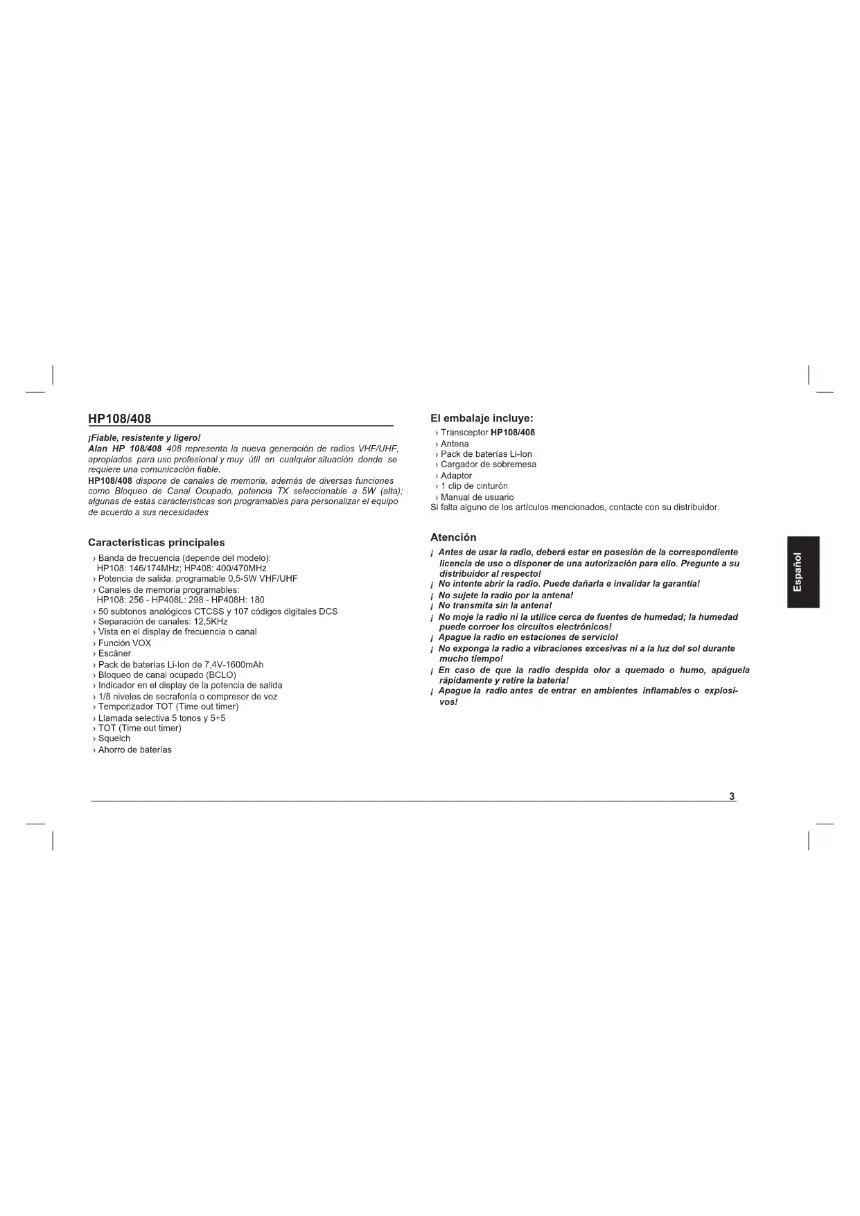 HP108/408 ¡Fiable, resistente y ligero! Alan HP 108/408 408 representa la nueva generación de radios VHF/UHF, apropiados para uso profesional y muy útil en cualquier situación donde se requiere una comunicación able. HP108/408 dispone de canales de memoria, además de diversas funciones como Bloqueo de Canal Ocupado, potencia TX seleccionable a 5W (alta); algunas de estas características son programables para personalizar el equipo de acuerdo a sus necesidades Características principales › Banda de frecuencia (depende del modelo): HP108: 146/174MHz; HP408: 400/470MHz › Potencia de salida: programable 0,5-5W VHF/UHF › Canales de memoria programables: HP108: 256 - HP408L: 298 - HP408H: 180 › 50 subtonos analógicos CTCSS y 107 códigos digitales DCS › Separación de canales: 12,5KHz › Vista en el display de frecuencia o canal › Función VOX › Escáner › Pack de baterías Li-Ion de 7,4V-1600mAh › Bloqueo de canal ocupado (BCLO) › Indicador en el display de la potencia de salida › 1/8 niveles de secrafonía o compresor de voz › Temporizador TOT (Time out timer) › Llamada selectiva 5 tonos y 5+5 › TOT (Time out timer) › Squelch › Ahorro de baterías El embalaje incluye: › Transceptor HP108/408 › Antena › Pack de baterías Li-Ion › Cargador de sobremesa › Adaptor › 1 clip de cinturón › Manual de usuario Si falta alguno de los artículos mencionados, contacte con su distribuidor. Atención ¡ Antes de usar la radio, deberá estar en posesión de la correspondiente licencia de uso o disponer de una autorización para ello. Pregunte a su distribuidor al respecto! ¡ No intente abrir la radio. Puede dañarla e invalidar la garantía! ¡ No sujete la radio por la antena! ¡ No transmita sin la antena! ¡ No moje la radio ni la utilice cerca de fuentes de humedad; la humedad puede corroer los circuitos electrónicos! ¡ Apague la radio en estaciones de servicio! ¡ No exponga la radio a vibraciones excesivas ni a la luz del sol durante mucho tiempo! ¡ En caso de que la radio despida olor a quemado o humo, apáguela rápidamente y retire la batería! ¡ Apague la radio antes de entrar en ambientes inamables o explosi- vos!Español