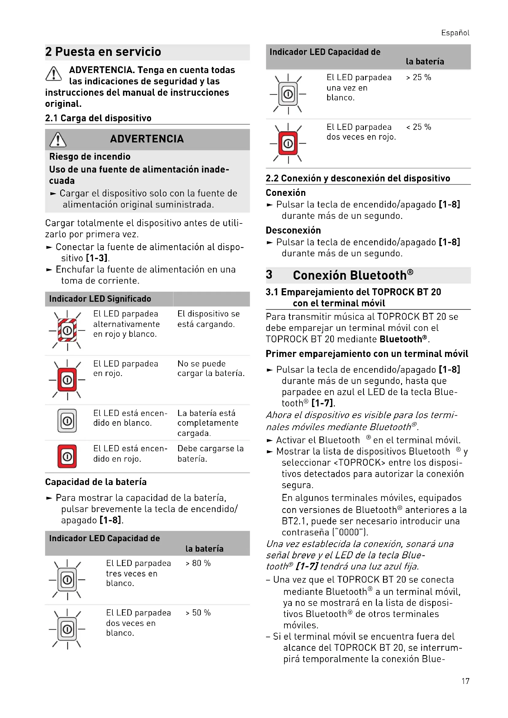 tooth. En el momento en que el terminal móvil vuelve a estar dentro del alcance, se restablecerá automatistically la conexión Bluetooth. Durante esta interrupción no se pueda conectar ningún或其他 terminal móvil con el TOPROCK BT 20.