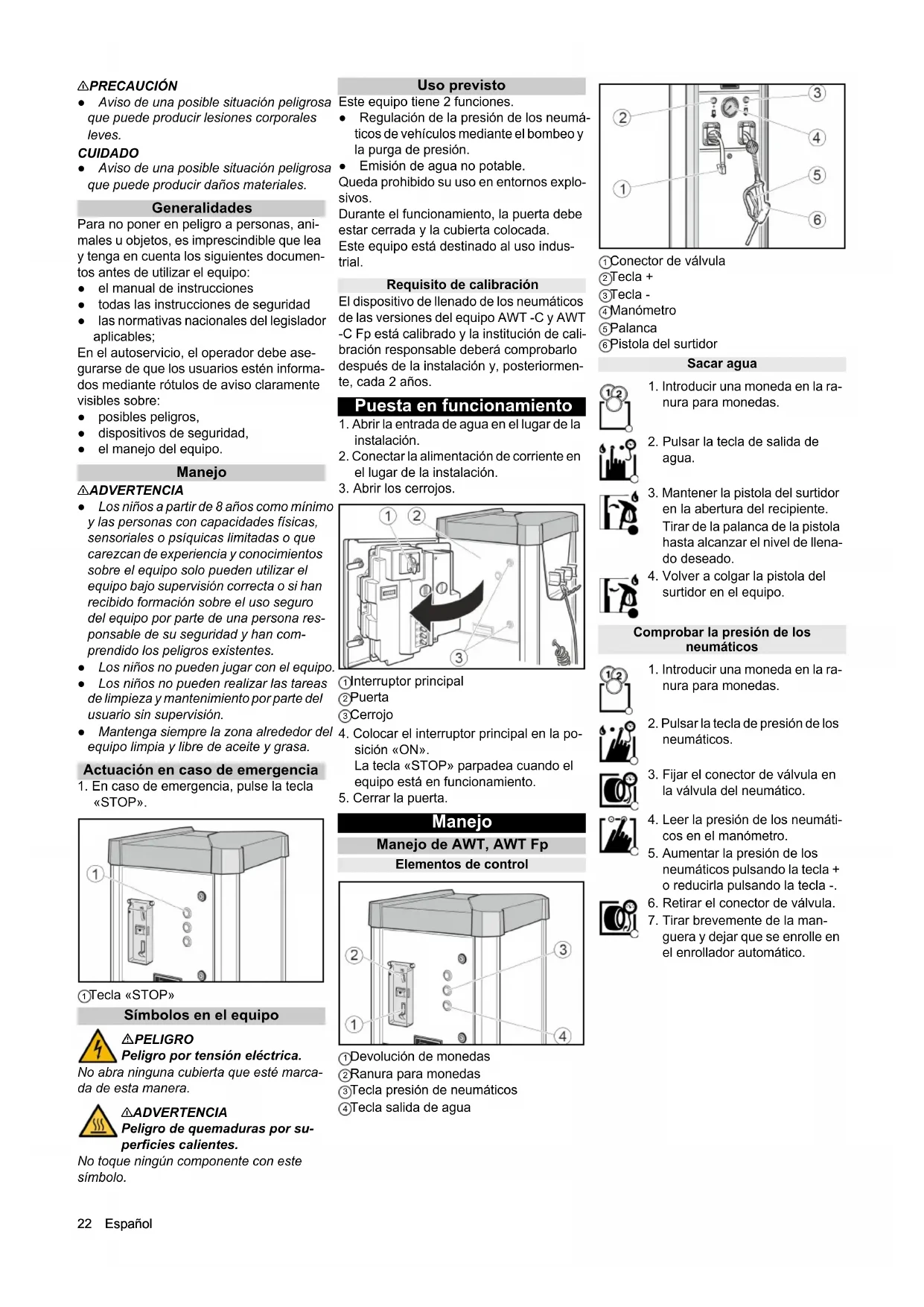 «STOP». 1 Tecla «STOP» Símbolos en el equipo PELIGRO Peligro por tensión eléctrica. No abra ninguna cubierta que esté marca- da de esta manera. 몇ADVERTENCIA Peligro de quemaduras por su- perficies calientes. No toque ningún componente con este símbolo. Uso previsto Este equipo tiene 2 funciones. ● Regulación de la presión de los neumá- ticos de vehículos mediante el bombeo y la purga de presión. ● Emisión de agua no potable. Queda prohibido su uso en entornos explo- sivos. Durante el funcionamiento, la puerta debe estar cerrada y la cubierta colocada. Este equipo está destinado al uso indus- trial. Requisito de calibración El dispositivo de llenado de los neumáticos de las versiones del equipo AWT -C y AWT -C Fp está calibrado y la institución de cali- bración responsable deberá comprobarlo después de la instalación y, posteriormen- te, cada 2 años. Puesta en funcionamiento