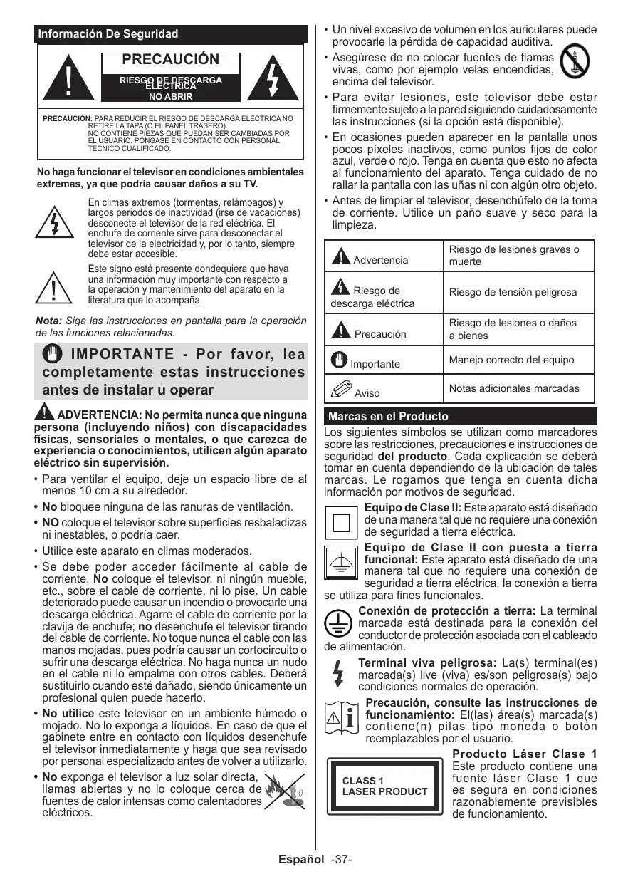 Contenido Información De Seguridad37 Marcas en el Producto37 Mantenimiento38 Cable de Alimentación39 Montaje / Desmontaje del Pedestal39 Cuando se utiliza el soporte de pared que cuelga.39 Información Medioambiental40 Notificaciones del modo en espera40 Funciones40 Accesorios Incluidos40 Botones de Control y Funcionamiento del Televisor40 Colocación de las pilas en el mando a distancia...41 Conecte la Energía 41 Notificación41 Especificacion42 Mando a Distancia43 Conexiones45 Encendido/Apagado46 Instalación Inicial46 Reproducción multimedia por la entrada USB46 Menú del Media Player46 Contenido del Menú de TV47 Funcionamiento General Del Televisor50 Manejo de la lista de Canales50 Permite configurar las Opciones de Control Paterno50 Guía de Programación Electrónica (EPG)50 Actualización de Software51 Solución de Problemas y Consejos51 Modos Habituales de Visualización de Entrada de PC51 Compatibilidad con Señales AV y HDMI51 Formatos Admitidos Para El Modo USB52