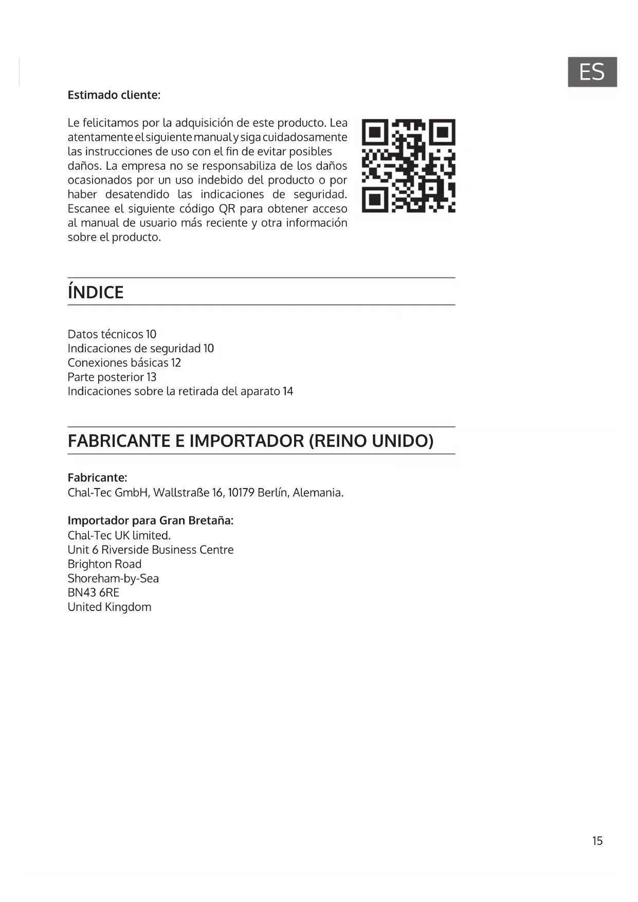 Estimado cliente: Le felicitamos por la adquisición de este producto. Lea atentamente el siguiente manual y siga cuidadosamente las instrucciones de uso con el n de evitar posibles daños. La empresa no se responsabiliza de los daños ocasionados por un uso indebido del producto o por haber desatendido las indicaciones de seguridad. Escanee el siguiente código QR para obtener acceso al manual de usuario más reciente y otra información sobre el producto. ÍNDICE FABRICANTE E IMPORTADOR (REINO UNIDO) Fabricante: Chal-Tec GmbH, Wallstraße 16, 10179 Berlín, Alemania. Importador para Gran Bretaña: Chal-Tec UK limited. Unit 6 Riverside Business Centre Brighton Road Shoreham-by-Sea BN43 6RE United Kingdom Datos técnicos 10 Indicaciones de seguridad 10 Conexiones básicas 12 Parte posterior 13 Indicaciones sobre la retirada del aparato 1416