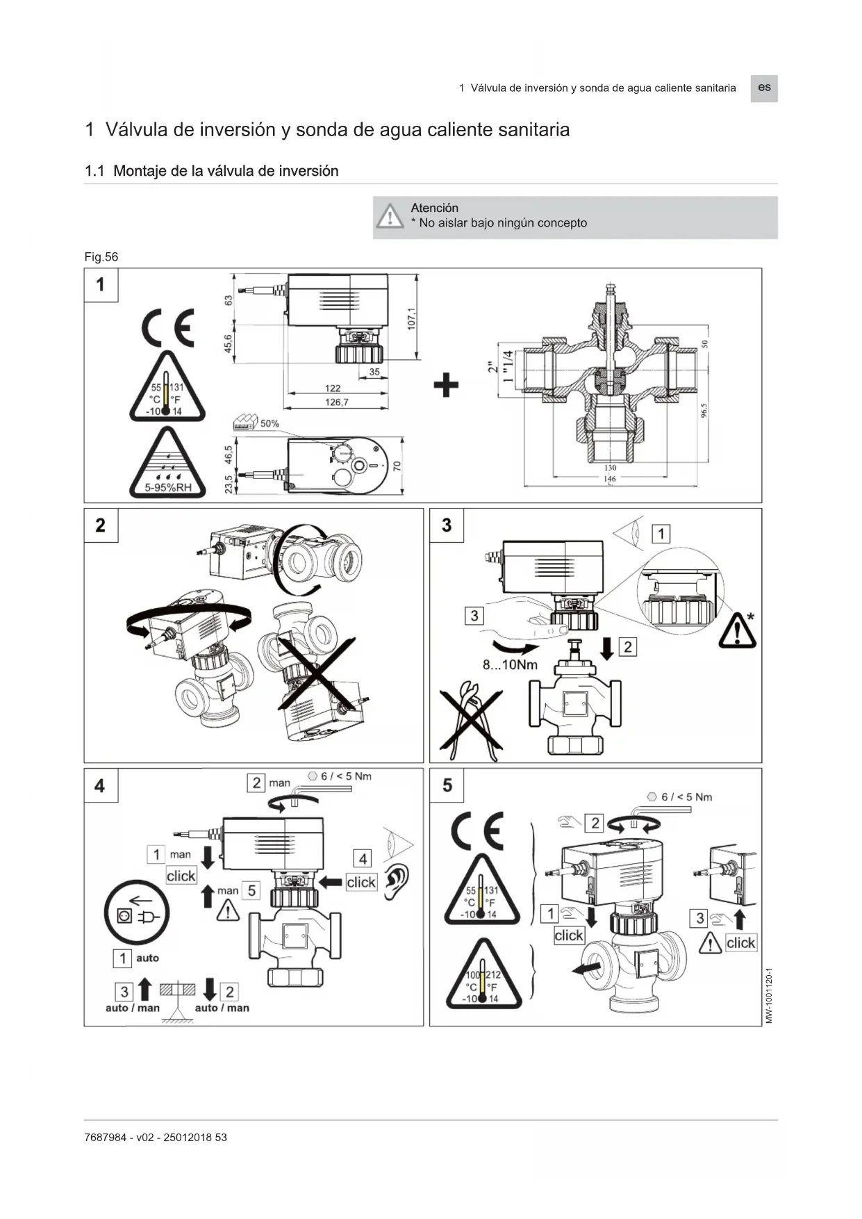 - No aislar bajo ningún concepto Fig.56 MW-1001120-1 1 Válvula de inversión y sonda de agua caliente sanitaria