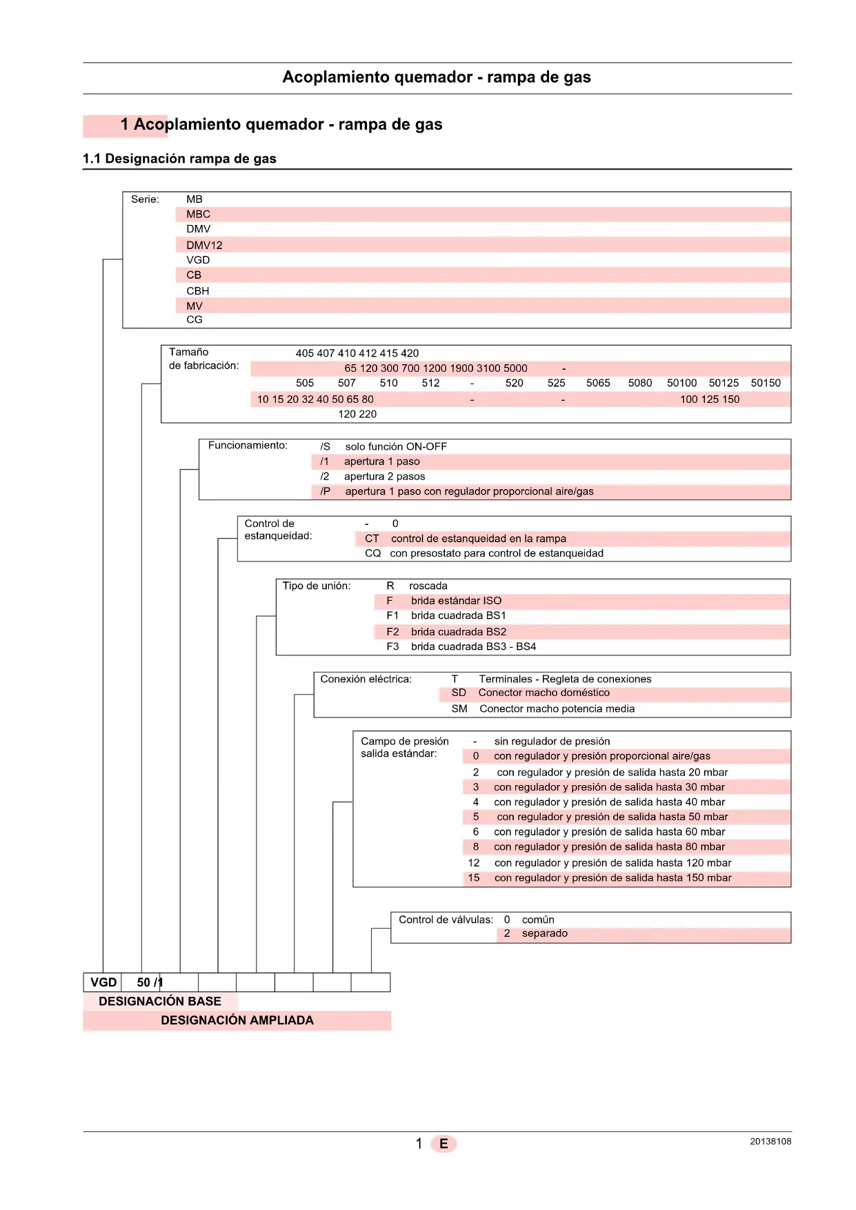Tipo de unión: F brida estándar ISO F1 brida cuadrada BS1 R roscada F2 brida cuadrada BS2 F3 brida cuadrada BS3 - BS4 Conexión eléctrica: SD Conector macho doméstico SM Conector macho potencia media T Terminales - Regleta de conexiones - sin regulador de presión 0 con regulador y presión proporcional aire/gas 2 con regulador y presión de salida hasta 20 mbar 3 con regulador y presión de salida hasta 30 mbar 4 con regulador y presión de salida hasta 40 mbar 5 con regulador y presión de salida hasta 50 mbar 8 con regulador y presión de salida hasta 80 mbar 15 con regulador y presión de salida hasta 150 mbar Campo de presión salida estándar: 0 común 2 separado Control de válvulas: