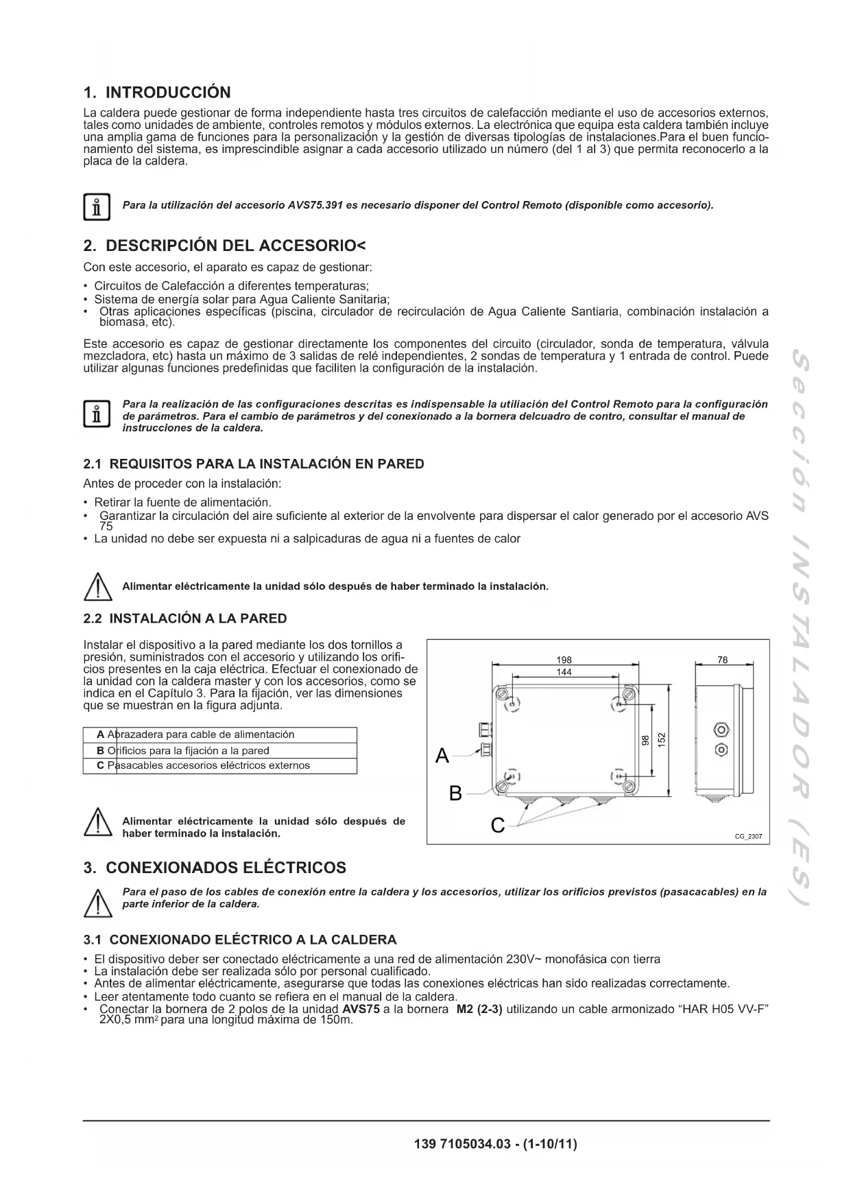 La caldera puede gestionar de forma independiente hasta tres circuitos de calefacción mediante el uso de accesorios externos, tales como unidades de ambiente, controles remotos y módulos externos. La electrónica que equipa esta caldera también incluye una amplia gama de funciones para la personalización y la gestión de diversas tipologías de instalaciones.Para el buen funcio- namiento del sistema, es imprescindible asignar a cada accesorio utilizado un número (del 1 al 3) que permita reconocerlo a la placa de la caldera. Para la utilización del accesorio AVS75.391 es necesario disponer del Control Remoto (disponible como accesorio).