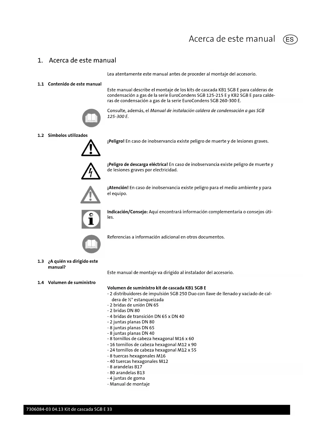 Volumen de suministro kit de cascada KB1 SGB E - 2 distribuidores de impulsión SGB 250 Duo con llave de llenado y vaciado de cal- dera de ½" estanqueizada - 2 bridas de unión DN 65 - 2 bridas DN 80 - 4 bridas de transición DN 65 x DN 40 - 2 juntas planas DN 80 - 8 juntas planas DN 65 - 8 juntas planas DN 40 - 8 tornillos de cabeza hexagonal M16 x 60 - 16 tornillos de cabeza hexagonal M12 x 90 - 24 tornillos de cabeza hexagonal M12 x 55 - 8 tuercas hexagonales M16 - 40 tuercas hexagonales M12 - 8 arandelas B17 - 80 arandelas B13 - 4 juntas de goma - Manual de montaje Acerca de este manual 7306084-03 04.13 Kit de cascada SGB E 33 ESVolumen de suministro kit de cascada KB2 SGB E - 2 distribuidores de impulsión SGB 600 Duo con llave de llenado y vaciado de cal- dera de ½" estanqueizada - 2 bridas de unión DN 65 - 2 bridas DN 100 - 2 juntas planas DN 100 - 6 juntas planas DN 65 - 4 juntas planas DN 50 - 8 tornillos de cabeza hexagonal M16 x 60 - 8 tornillo de cabeza hexagonal M12 x 100 - 40 tornillos de cabeza hexagonal M12 x 60 - 8 tuercas hexagonales M16 - 48 tuercas hexagonales M12 - 16 arandelas B17 - 96 arandelas B13 - 4 juntas de goma - Manual de montaje Acerca de este manual 34 Kit de cascada SGB E 7306084-03 04.13 ES2. Seguridad ¡Peligro! Observe las siguientes instrucciones de seguridad para evitar peligros pa- ra usted mismo y para otras personas.