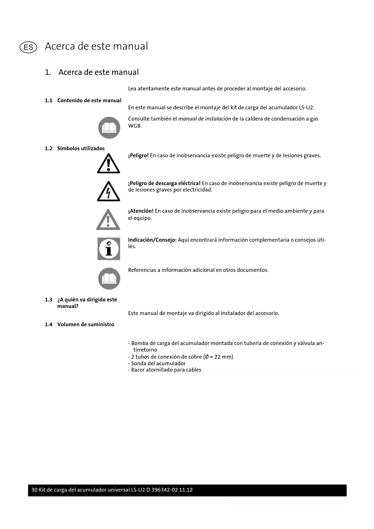 - Bomba de carga del acumulador montada con tubería de conexión y válvula an- tirretorno - 2 tubos de conexión de cobre (Ø = 22 mm) - Sonda del acumulador - Racor atornillado para cables Acerca de este manual 30 Kit de carga del acumulador universal LS-U2 D 396342-02 11.12 ES2. Seguridad
