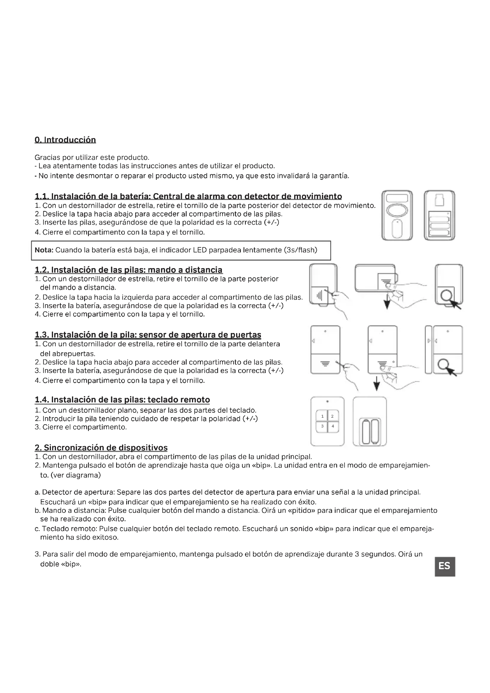 Gracias por utilizar este producto. - Lea atentamente todas las instrucciones antes de utilizar el producto. - No intente desmontar o reparar el producto usted mismo, ya que esto invalidará la garantía. 1.1. Instalación de la batería: Central de alarma con detector de movimiento