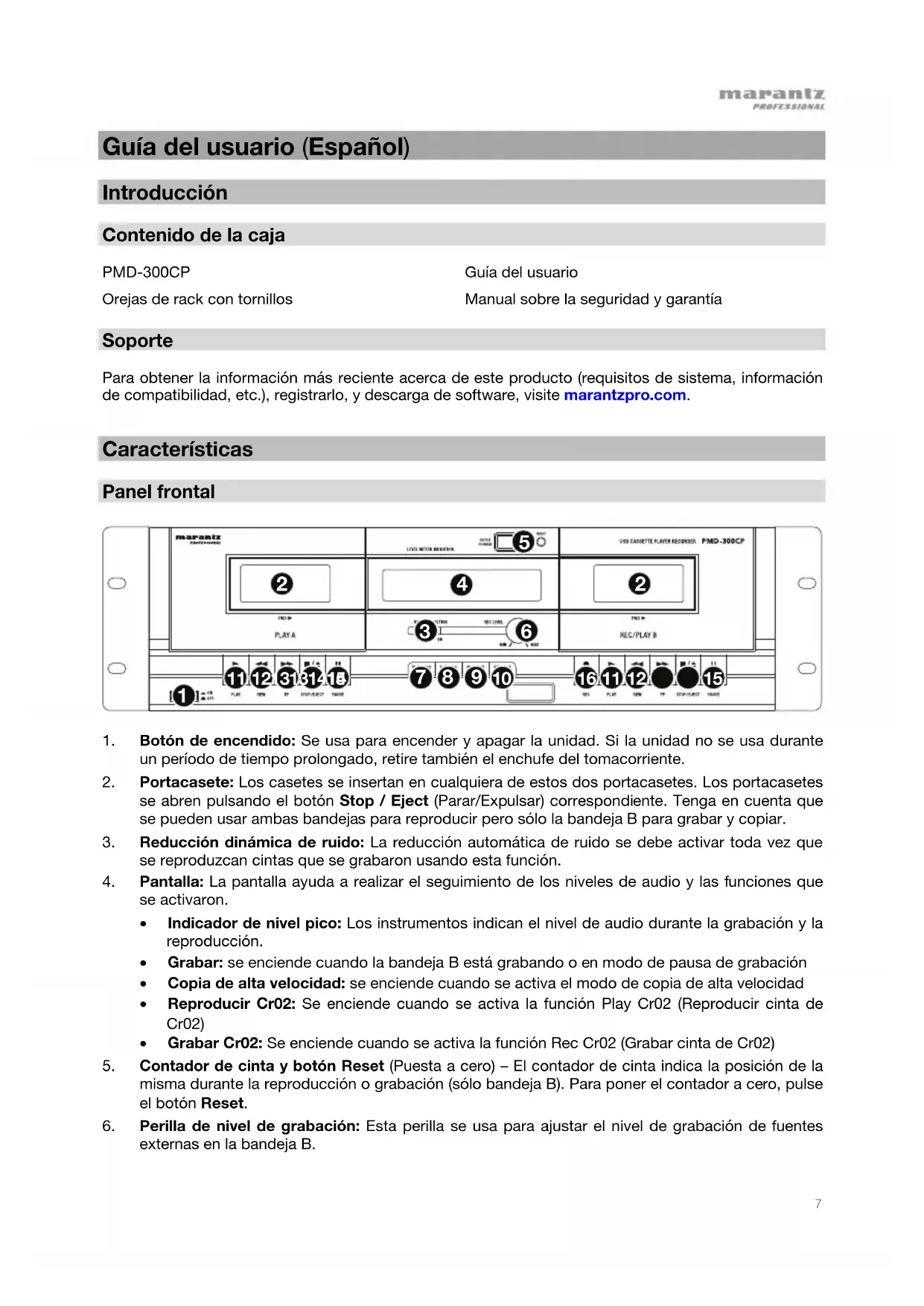 Soporte Para obtener la información más reciente acerca de este producto (requisitos de sistema, información de compatibilidad, etc.), registrarlo, y descarga de software, visite marantzpro.com. Características Panel frontal