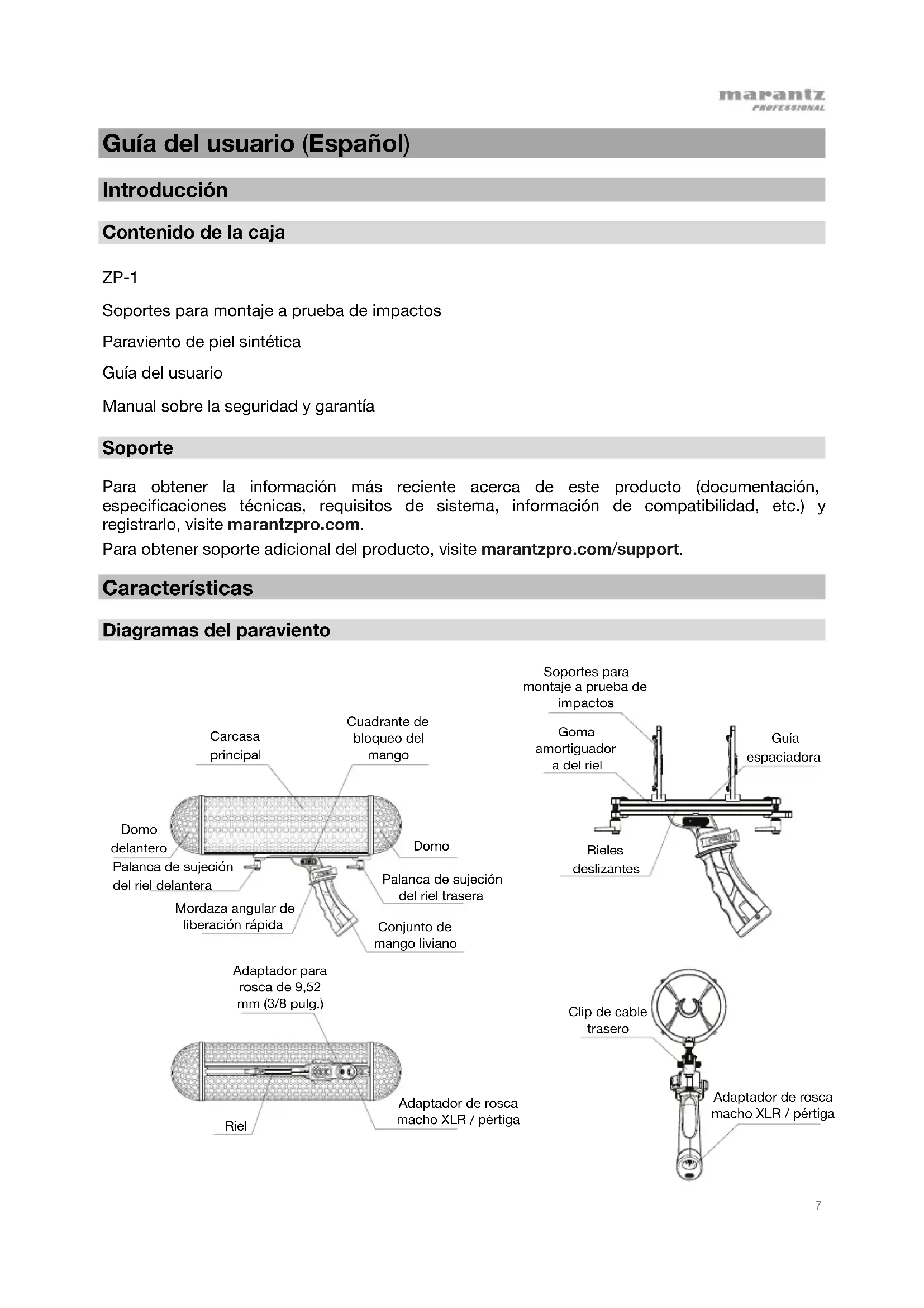 Guía del usuario (Español) Introducción Contenido de la caja ZP-1 Soportes para montaje a prueba de impactos Paraviento de piel sintética Guía del usuario Manual sobre la seguridad y garantía Soporte Para obtener la información más reciente acerca de este producto (documentación, especificaciones técnicas, requisitos de sistema, información de compatibilidad, etc.) y registrarlo, visite marantzpro.com. Para obtener soporte adicional del producto, visite marantzpro.com/support. Características Diagramas del paraviento