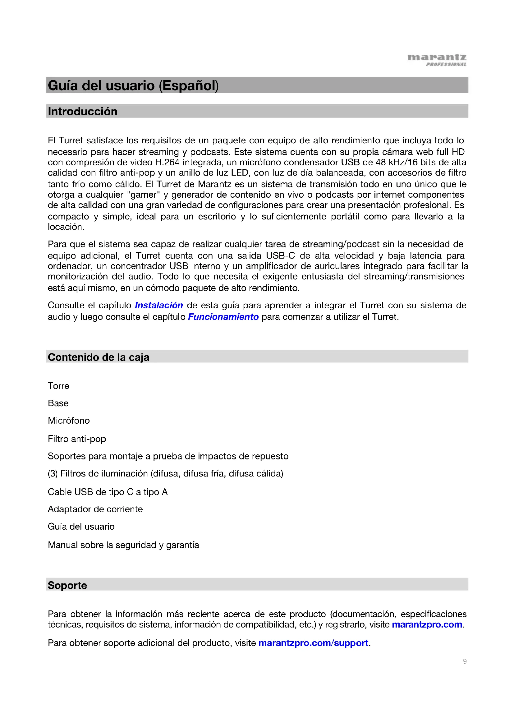 Guía del usuario (Español) Introducción El Turret satisface los requisitos de un paquete con equipo de alto rendimiento que incluya todo lo necesario para hacer streaming y podcasts. Este sistema cuenta con su propia cámara web full HD con compresión de video H.264 integrada, un micrófono condensador USB de 48 kHz/16 bits de alta calidad con filtro anti-pop y un anillo de luz LED, con luz de día balanceada, con accesorios de filtro tanto frío como cálido. El Turret de Marantz es un sistema de transmisión todo en uno único que le otorga a cualquier "gamer" y generador de contenido en vivo o podcasts por internet componentes de alta calidad con una gran variedad de configuraciones para crear una presentación profesional. Es compacto y simple, ideal para un escritorio y lo suficientemente portátil como para llevarlo a la locación. Para que el sistema sea capaz de realizar cualquier tarea de streaming/podcast sin la necesidad de equipo adicional, el Turret cuenta con una salida USB-C de alta velocidad y baja latencia para ordenador, un concentrador USB interno y un amplificador de auriculares integrado para facilitar la monitorización del audio. Todo lo que necesita el exigente entusiasta del streaming/transmisiones está aquí mismo, en un cómodo paquete de alto rendimiento. Consulte el capítulo Instalación de esta guía para aprender a integrar el Turret con su sistema de audio y luego consulte el capítulo Funcionamiento para comenzar a utilizar el Turret.
