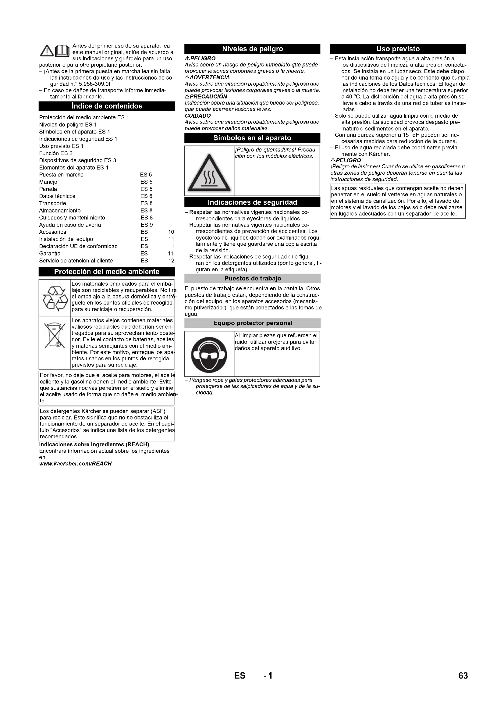 Watertoevoer pH-waarde 6,5...9,5Geleidend vermogen < 2000 µS/cmbezinkbare stoffen < 0,5 mg/l *filtreerbare stoffen (korrelgrootte minder dan 0,025 mm)< 20 mg/lKoolwaterstoffen < 20 mg/lChloride < 300 mg/lCalcium < 85 mg/l **Totale hardheid < 15 °dH **IJzer < 0,5 mg/lMangaan < 0,05 mg/lKoper < 0,02 mg/lvrij van kwalijke geurtjes Elektrische aansluiting EU-conformiteitsverklaring Product: HogedrukreinigerType: 2.509-xxxVan toepassing zijnde EU-richtlijnen2006/42/EG (+2009/127/EG)2009/125/EG2011/65/EU2014/30/EUToegepaste geharmoniseerde normenEN IEC 63000: 2018EN 55014–1: 2017 + A11: 2020EN 55014–2: 2015EN 60335–1EN 60335–2–79EN 61000–3–2: 2014EN 61000–3–3: 2013EN 61000–3–12: 2011EN 61000–6–2: 2005EN 61000–6–4: 2007EN 62233: 2008Toegepaste verordeningen(EU) 2019/1781 Garantie Chairman of the Board of ManagementDirector Regulatory Affairs & Certification 61NL- 12 Klantenservice Soort installatie: Fabrieksnr.: In bedrijf genomen op: Test uitgevoerd op: Uitslag: Handtekening Test uitgevoerd op: Uitslag: Handtekening Test uitgevoerd op: Uitslag: Handtekening Test uitgevoerd op: Uitslag: Handtekening 62 NL- 1 Antes del primer uso de su aparato, lea este manual original, actúe de acuerdo a sus indicaciones y guárdelo para un uso posterior o para otro propietario posterior. – ¡Antes de la primera puesta en marcha lea sin falta las instrucciones de uso y las instrucciones de se- guridad n.° 5.956-309.0! – En caso de daños de transporte informe inmedia- tamente al fabricante. Indicaciones sobre ingredientes (REACH) Encontrará información actual sobre los ingredientes en: www.kaercher.com/REACH PELIGRO Aviso sobre un riesgo de peligro inmediato que puede provocar lesiones corporales graves o la muerte. 몇 ADVERTENCIA Aviso sobre una situación propablemente peligrosa que puede provocar lesiones corporales graves o la muerte. 몇 PRECAUCIÓN Indicación sobre una situación que puede ser peligrosa, que puede acarrear lesiones leves. CUIDADO Aviso sobre una situación probablemente peligrosa que puede provocar daños materiales. – Respetar las normativas vigentes nacionales co- rrespondientes para eyectores de líquidos. – Respetar las normativas vigentes nacionales co- rrespondientes de prevención de accidentes. Los eyectores de líquidos deben ser examinados regu- larmente y tiene que guardarse una copia escrita de la revisión. – Respetar las indicaciones de seguridad que figu- ran en los detergentes utilizados (por lo general, fi- guran en la etiqueta). El puesto de trabajo se encuentra en la pantalla. Otros puestos de trabajo están, dependiendo de la construc- ción del equipo, en los aparatos accesorios (mecanis- mo pulverizador), que están conectados a las tomas de agua. – Póngase ropa y gafas protectoras adecuadas para protegerse de las salpicaduras de agua y de la su- ciedad. – Esta instalación transporta agua a alta presión a los dispositivos de limpieza a alta presión conecta- dos. Se instala en un lugar seco. Este debe dispo- ner de una toma de agua y de corriente que cumpla las indicaciones de los Datos técnicos. El lugar de instalación no debe tener una temperatura superior a 40 ºC. La distribución del agua a alta presión se lleva a cabo a través de una red de tuberías insta- ladas. – Sólo se puede utilizar agua limpia como medio de alta presión. La suciedad provoca desgasto pre- maturo o sedimentos en el aparato. – Con una dureza superior a 15 °dH pueden ser ne- cesarias medidas para reducción de la dureza. – El uso de agua reciclada debe coordinarse previa- mente con Kärcher. PELIGRO ¡Peligro de lesiones! Cuando se utilice en gasolineras u otras zonas de peligro deberán tenerse en cuenta las instrucciones de seguridad. Índice de contenidos Protección del medio ambiente ES 1 Niveles de peligro ES 1 Símbolos en el aparato ES 1 Indicaciones de seguridad ES 1 Uso previsto ES 1 Función ES 2 Dispositivos de seguridad ES 3 Elementos del aparato ES 4 Puesta en marcha ES 5 Manejo ES 5 Parada ES 5 Datos técnicos ES 6 Transporte ES 8 Almacenamiento ES 8 Cuidados y mantenimiento ES 8 Ayuda en caso de avería ES 9 Accesorios ES 10 Instalación del equipo ES 11 Declaración UE de conformidad ES 11 Garantía ES 11 Servicio de atención al cliente ES 12 Protección del medio ambiente Los materiales empleados para el emba- laje son reciclables y recuperables. No tire el embalaje a la basura doméstica y entré- guelo en los puntos oficiales de recogida para su reciclaje o recuperación. Los aparatos viejos contienen materiales valiosos reciclables que deberían ser en- tregados para su aprovechamiento poste- rior. Evite el contacto de baterías, aceites y materias semejantes con el medio am- biente. Por este motivo, entregue los apa- ratos usados en los puntos de recogida previstos para su reciclaje. Por favor, no deje que el aceite para motores, el aceite caliente y la gasolina dañen el medio ambiente. Evite que sustancias nocivas penetren en el suelo y elimine el aceite usado de forma que no dañe el medio ambien- te. Los detergentes Kärcher se pueden separar (ASF) para reciclar. Esto significa que no se obstaculiza el funcionamiento de un separador de aceite. En el capí- tulo "Accesorios" se indica una lista de los detergentes recomendados. Niveles de peligro Símbolos en el aparato ¡Peligro de quemaduras! Precau- ción con los módulos eléctricos. Indicaciones de seguridad Puestos de trabajo Equipo protector personal Al limpiar piezas que refuercen el ruido, utilizar orejeras para evitar daños del aparato auditivo. Uso previsto Las aguas residuales que contengan aceite no deben penetrar en el suelo ni verterse en aguas naturales o en el sistema de canalización. Por ello, el lavado de motores y el lavado de los bajos sólo debe realizarse en lugares adecuados con un separador de aceite. 63ES- 2 1 Colector de suciedad (por parte del cliente)2 sensor de temperatura3 Dispositivo de seguridad contra el funcionami