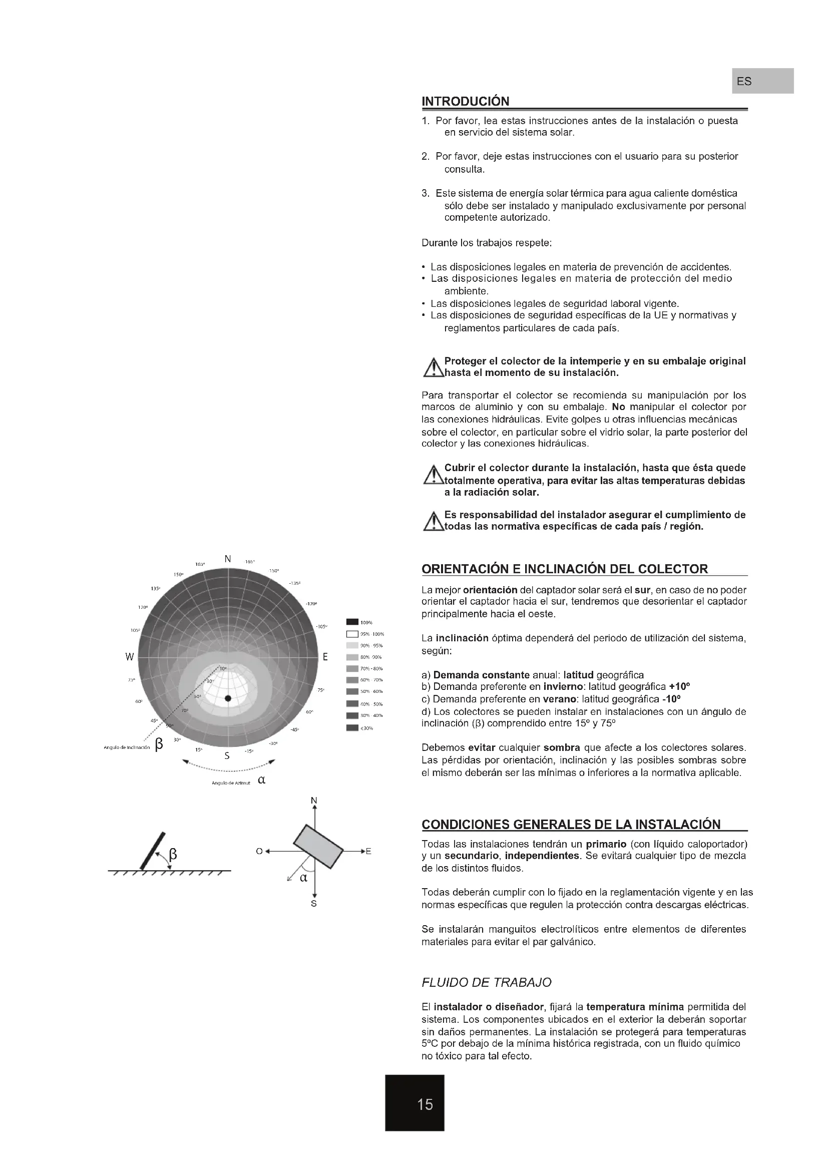 - Las disposiciones de seguridad especícas de la UE y normativas y reglamentos particulares de cada país. Proteger el colector de la intemperie y en su embalaje original hasta el momento de su instalación. Cubrir el colector durante la instalación, hasta que ésta quede totalmente operativa, para evitar las altas temperaturas debidas a la radiación solar. Es responsabilidad del instalador asegurar el cumplimiento de todas las normativa especícas de cada país / región. Para transportar el colector se recomienda su manipulación por los marcos de aluminio y con su embalaje. No manipular el colector por las conexiones hidráulicas. Evite golpes u otras inuencias mecánicas sobre el colector, en particular sobre el vidrio solar, la parte posterior del colector y las conexiones hidráulicas. La mejor orientación del captador solar será el sur, en caso de no poder orientar el captador hacia el sur, tendremos que desorientar el captador principalmente hacia el oeste. La inclinación óptima dependerá del periodo de utilización del sistema, según: a) Demanda constante anual: latitud geográca b) Demanda preferente en invierno: latitud geográca +10º c) Demanda preferente en verano: latitud geográca -10º d) Los colectores se pueden instalar en instalaciones con un ángulo de inclinación (β) comprendido entre 15º y 75º Debemos evitar cualquier sombra que afecte a los colectores solares. Las pérdidas por orientación, inclinación y las posibles sombras sobre el mismo deberán ser las mínimas o inferiores a la normativa aplicable. Todas las instalaciones tendrán un primario (con líquido caloportador) y un secundario, independientes. Se evitará cualquier tipo de mezcla de los distintos uidos. Todas deberán cumplir con lo jado en la reglamentación vigente y en las normas especícas que regulen la protección contra descargas eléctricas. Se instalarán manguitos electrolíticos entre elementos de diferentes materiales para evitar el par galvánico.