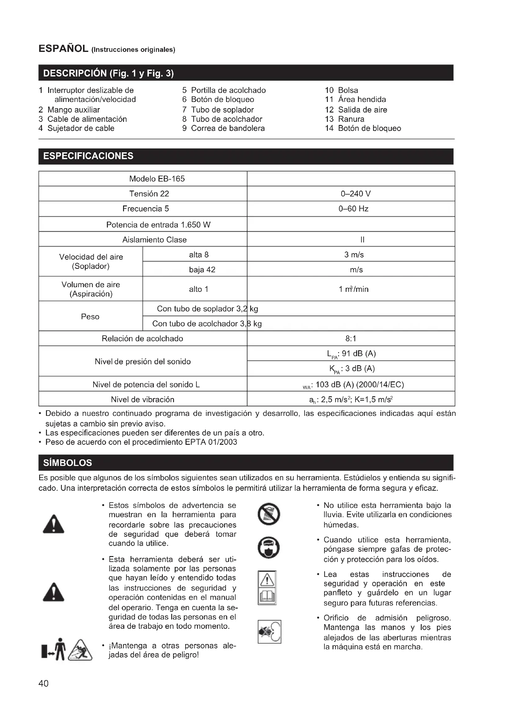 Descarga las instrucciones para tu Soplador en formato PDF gratis! Encuentra tus instrucciones EB165 - DOLMAR y toma tu dispositivo electrónico nuevamente en la mano. En esta página están publicados todos los documentos necesarios para el uso de su dispositivo. EB165 de la marca DOLMAR.